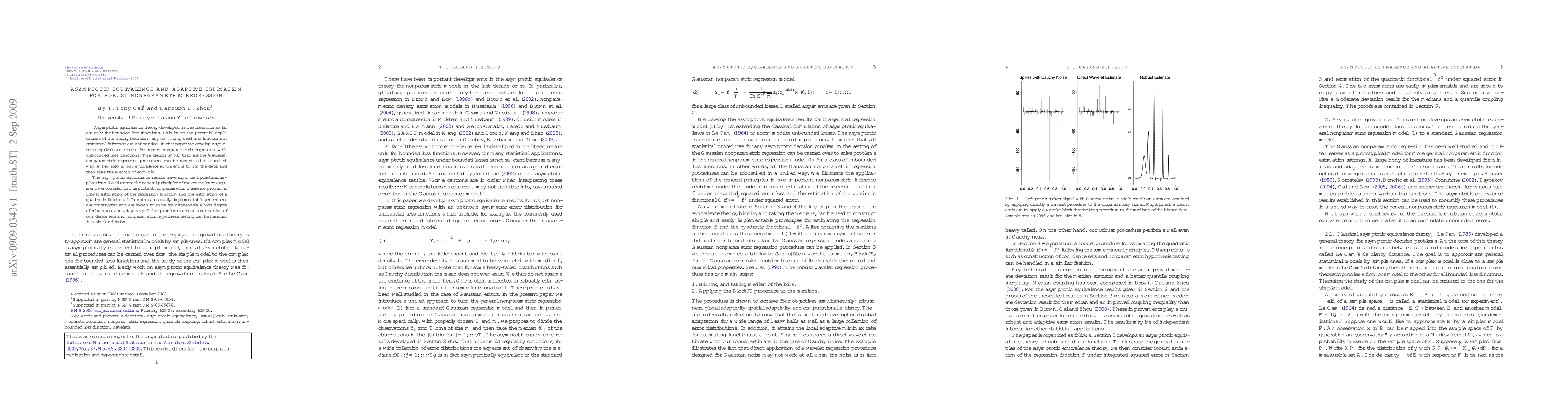 This paper extends asymptotic equivalence theory to robust nonparametric regression using unbounded loss functions, enabling the robustification of Gaussian nonparametric regression procedures. The method involves binning data and taking bin medians, leading to practical, robust, and adaptive estimation procedures for regression functions and quadratic functionals.