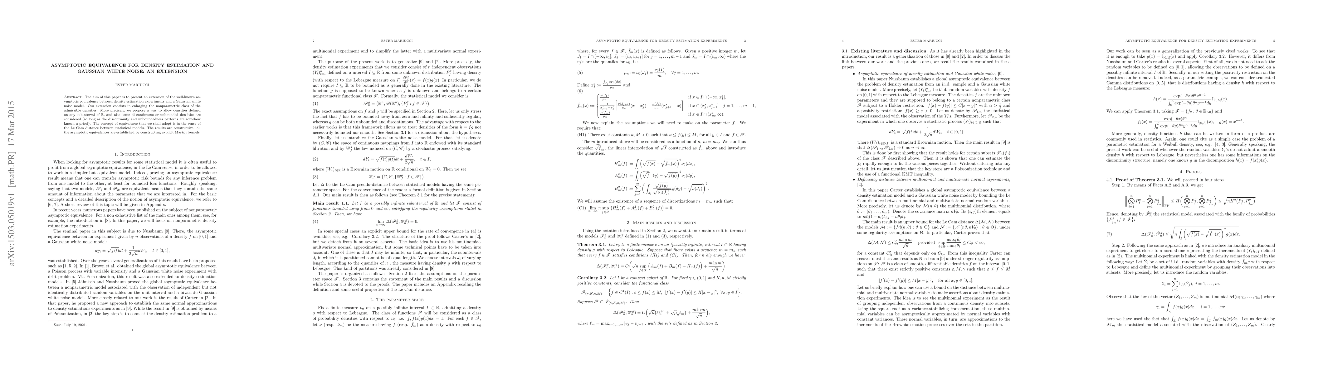 This paper extends the asymptotic equivalence between density estimation and Gaussian white noise, allowing for densities defined on any subinterval of R, including discontinuous or unbounded ones, provided their patterns are known. The equivalence is established using the Le Cam distance and explicit Markov kernels.