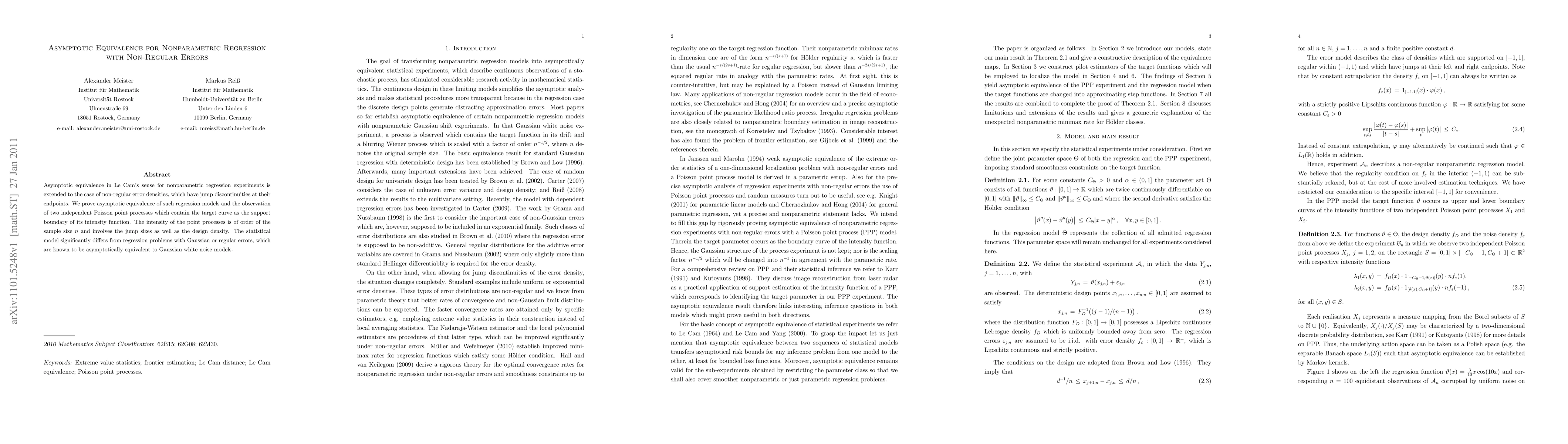 This paper extends asymptotic equivalence in Le Cam's sense to nonparametric regression models with non-regular error densities featuring jump discontinuities. It demonstrates the equivalence between such regression models and observing two independent Poisson point processes, with the sample size $n$ influencing the intensity that incorporates jump sizes and the design density.