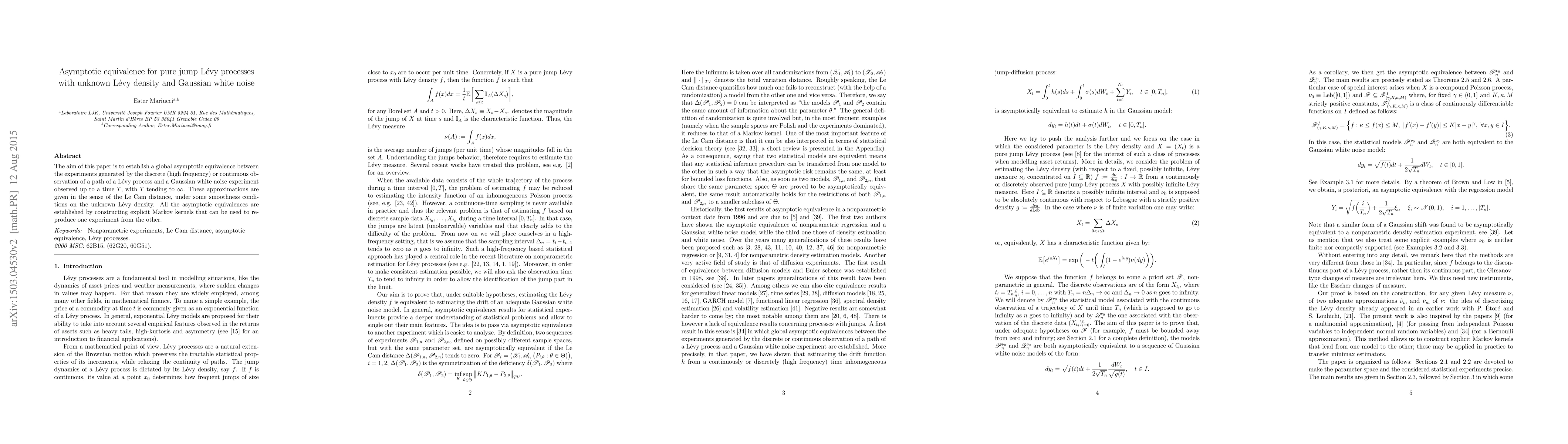 This research establishes asymptotic equivalence between Lévy process observations and Gaussian white noise experiments under certain conditions, allowing for the reproduction of one experiment from the other through explicit Markov kernels.