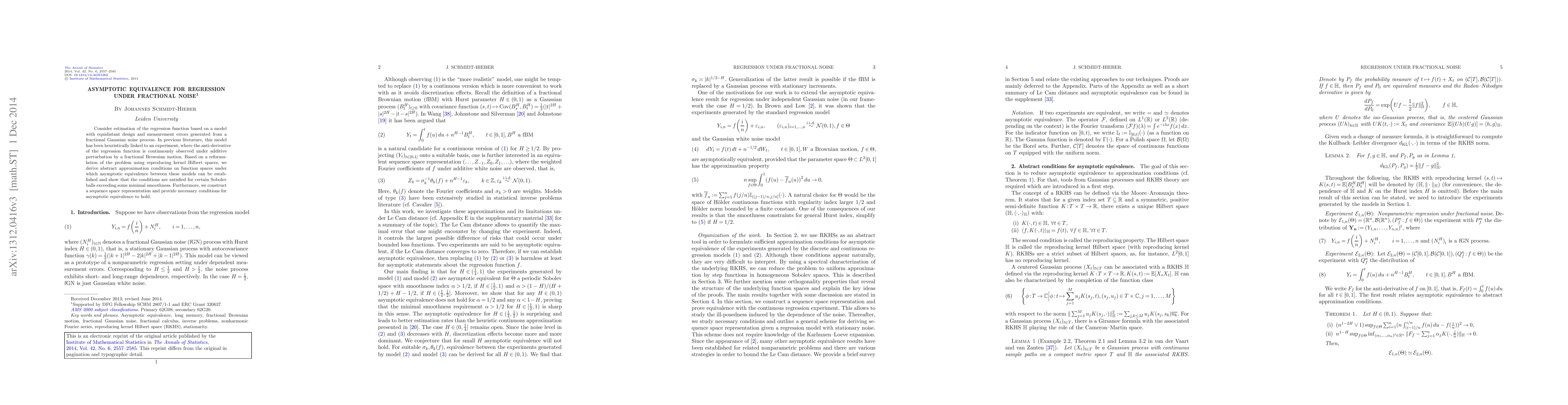 This paper establishes asymptotic equivalence between regression models with fractional Gaussian noise and a continuous observation model perturbed by fractional Brownian motion. It uses reproducing kernel Hilbert spaces to derive approximation conditions and shows these conditions hold for certain Sobolev balls, ensuring the equivalence under sufficient smoothness.