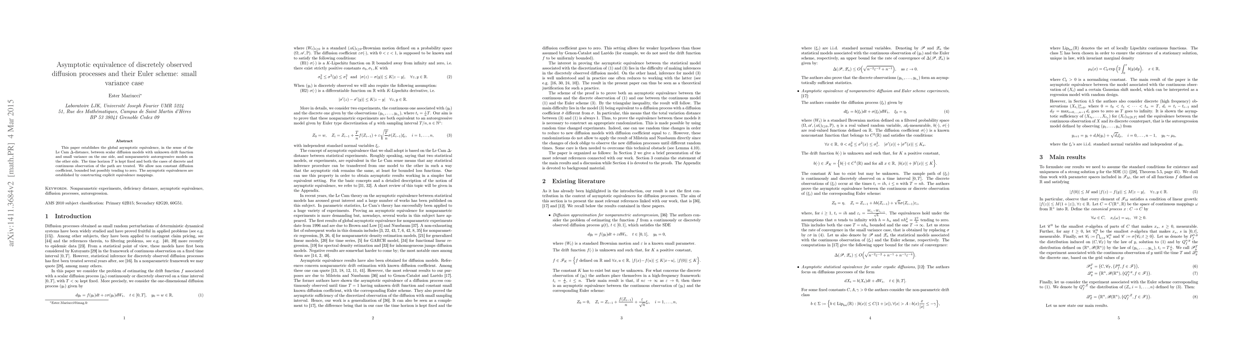 This paper establishes the global asymptotic equivalence, in the sense of the Le Cam $\Delta$-distance, between scalar diffusion models with unknown drift function and small variance on the one side, and nonparametric autoregressive models on the other side. The time horizon $T$ is kept fixed and both the cases of discrete and continuous observation of the path are treated. We allow non constant diffusion coefficient, bounded but possibly tending to zero. The asymptotic equivalences are established by constructing explicit equivalence mappings.