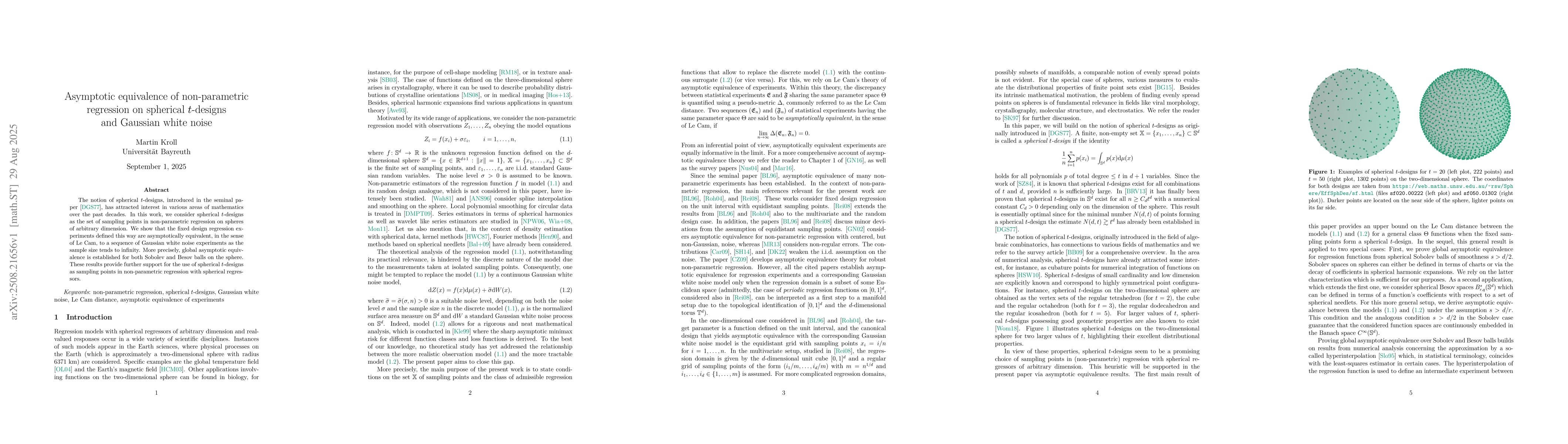 The notion of spherical $t$-designs has attracted interest in various areas of mathematics over the past decades. In this work, we consider spherical $t$-designs as the set of sampling points in non-parametric regression on spheres of arbitrary dimension. We show that the fixed design regression experiments defined this way are asymptotically equivalent, in the sense of Le Cam, to a sequence of Gaussian white noise experiments as the sample size tends to infinity. More precisely, global asymptotic equivalence is established for both Sobolev and Besov balls on the sphere. These results provide further support for the use of spherical $t$-designs as sampling points in non-parametric regression with spherical regressors.