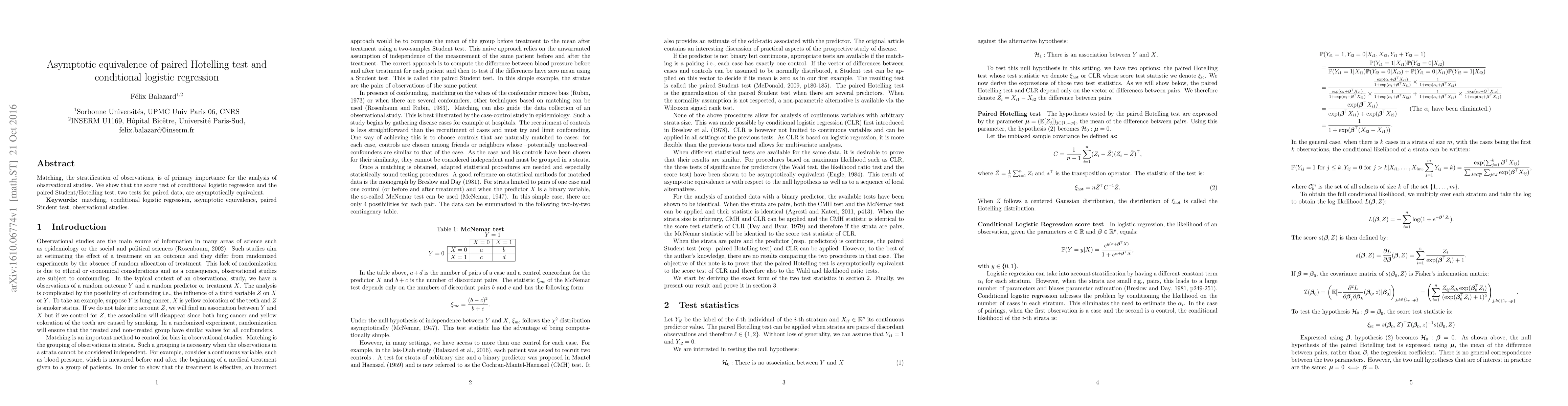 The paired Hotelling test and conditional logistic regression show asymptotic equivalence in matching observational studies, suggesting that one can be used to analyze data as the other.