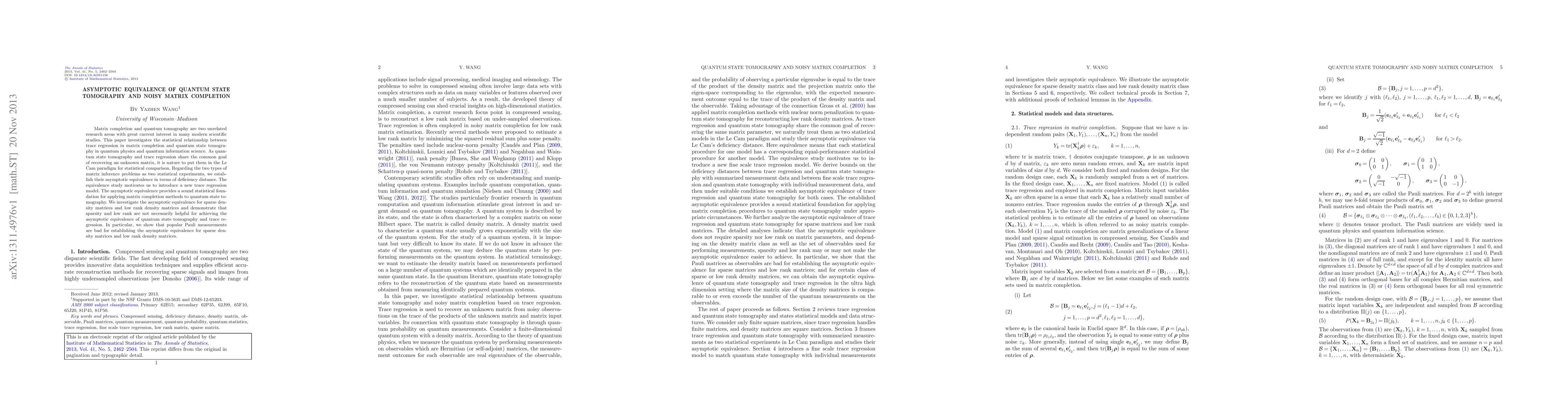 This paper establishes the asymptotic equivalence between quantum state tomography and trace regression in matrix completion, demonstrating that both methods can be viewed as statistical experiments for recovering unknown matrices. The study reveals that while sparsity and low rank can aid in matrix inference, they do not necessarily ensure the equivalence, especially for Pauli measurements.