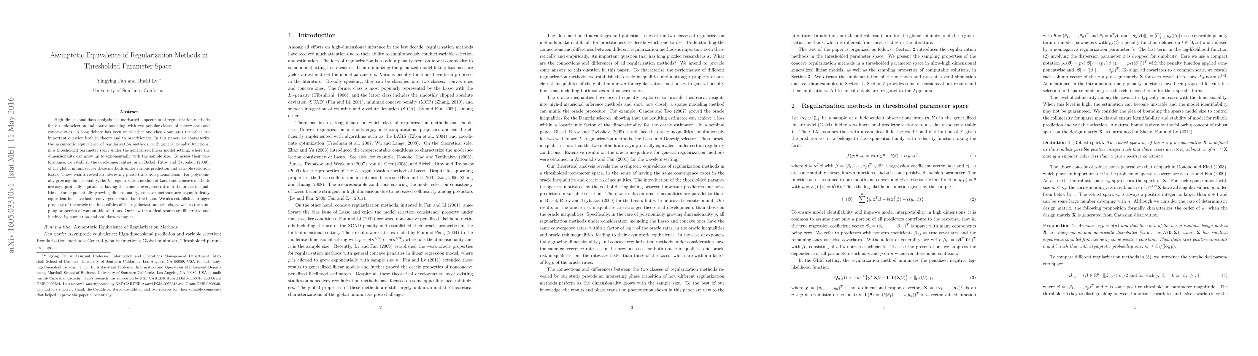 High-dimensional data analysis has motivated a spectrum of regularization methods for variable selection and sparse modeling, with two popular classes of convex ones and concave ones. A long debate has been on whether one class dominates the other, an important question both in theory and to practitioners. In this paper, we characterize the asymptotic equivalence of regularization methods, with general penalty functions, in a thresholded parameter space under the generalized linear model setting, where the dimensionality can grow up to exponentially with the sample size. To assess their performance, we establish the oracle inequalities, as in Bickel, Ritov and Tsybakov (2009), of the global minimizer for these methods under various prediction and variable selection losses. These results reveal an interesting phase transition phenomenon. For polynomially growing dimensionality, the $L_1$-regularization method of Lasso and concave methods are asymptotically equivalent, having the same convergence rates in the oracle inequalities. For exponentially growing dimensionality, concave methods are asymptotically equivalent but have faster convergence rates than the Lasso. We also establish a stronger property of the oracle risk inequalities of the regularization methods, as well as the sampling properties of computable solutions. Our new theoretical results are illustrated and justified by simulation and real data examples.