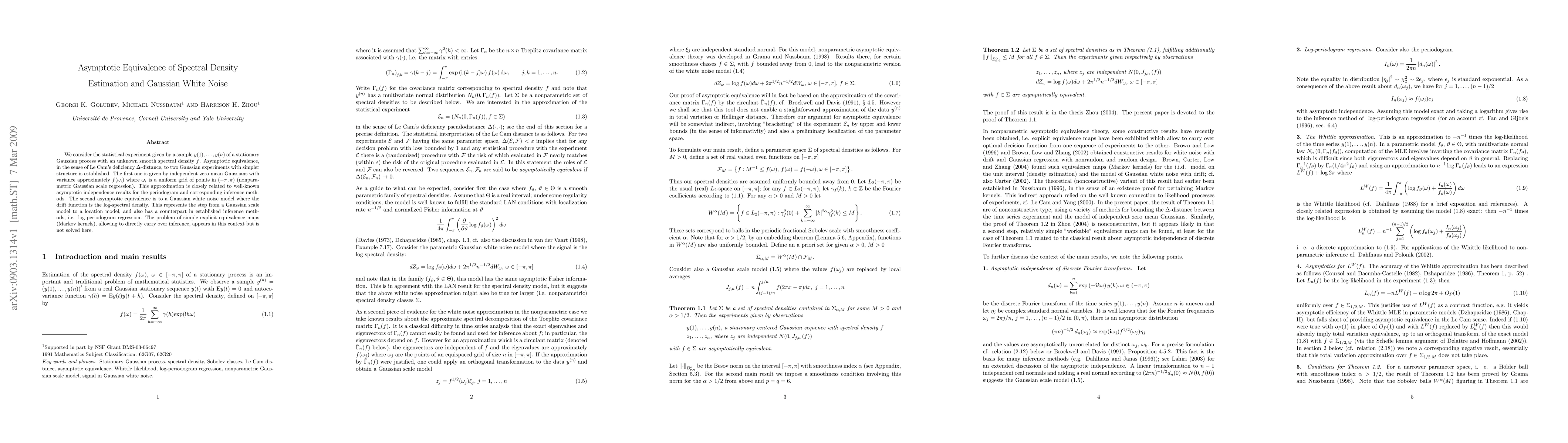 This paper establishes asymptotic equivalence between spectral density estimation of a stationary Gaussian process and two simpler Gaussian models: nonparametric Gaussian scale regression and Gaussian white noise. It highlights the connection between these models and established inference methods like periodogram and log-periodogram regression.