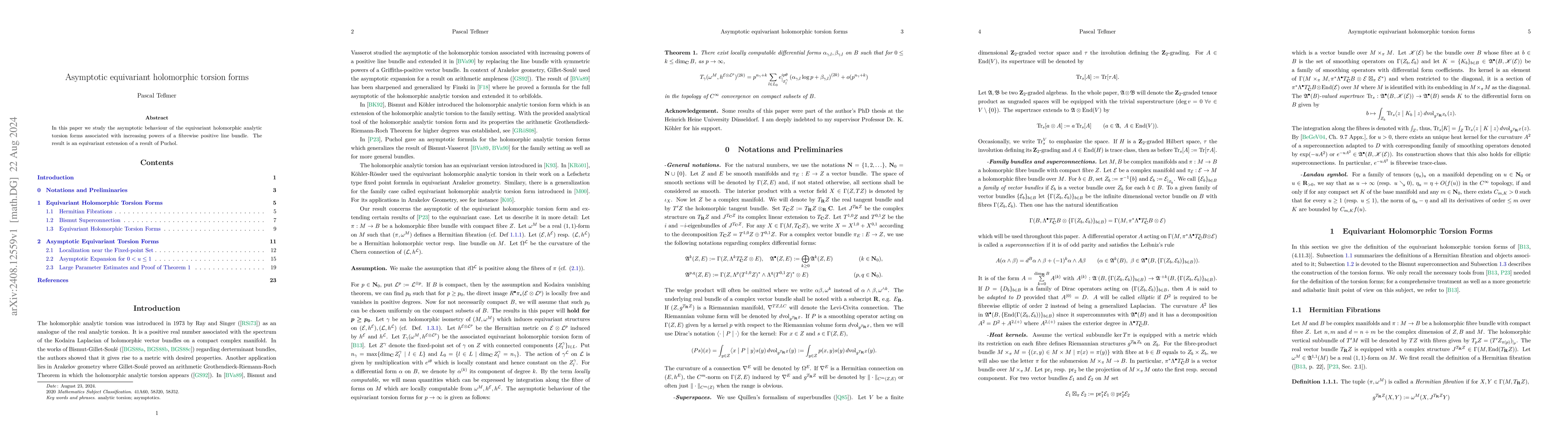 The paper studies the asymptotic behavior of equivariant holomorphic torsion forms associated with increasing powers of a fibrewise positive line bundle, extending a previous result by Puchol.