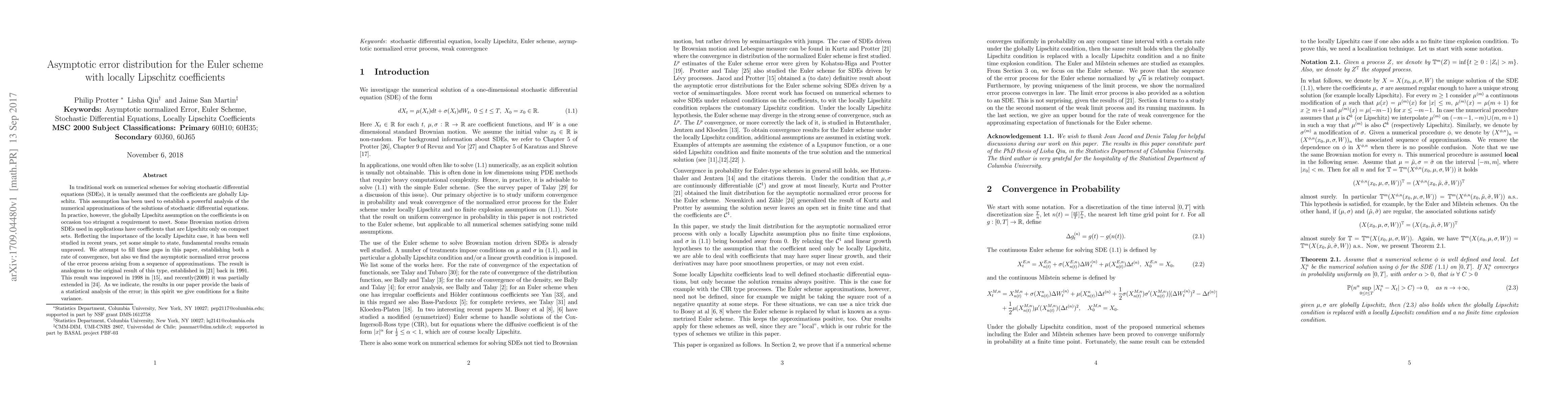 In traditional work on numerical schemes for solving stochastic differential equations (SDEs), it is usually assumed that the coefficients are globally Lipschitz. This assumption has been used to establish a powerful analysis of the numerical approximations of the solutions of stochastic differential equations. In practice, however, the globally Lipschitz assumption on the coefficients is on occasion too stringent a requirement to meet. Some Brownian motion driven SDEs used in applications have coefficients that are Lipschitz only on compact sets. Reflecting the importance of the locally Lipschitz case, it has been well studied in recent years, yet some simple to state, fundamental results remain unproved. We attempt to fill these gaps in this paper, establishing both a rate of convergence, but also we find the asymptotic normalized error process of the error process arising from a sequence of approximations. The result is analogous to the original result of this type, established in KT1991-2 back in 1991. This result was improved in 1998 in JJ1998, and recently(2009) it was partially extended in AN. As we indicate, the results in our paper provide the basis of a statistical analysis of the error; in this spirit we give conditions for a finite variance.
