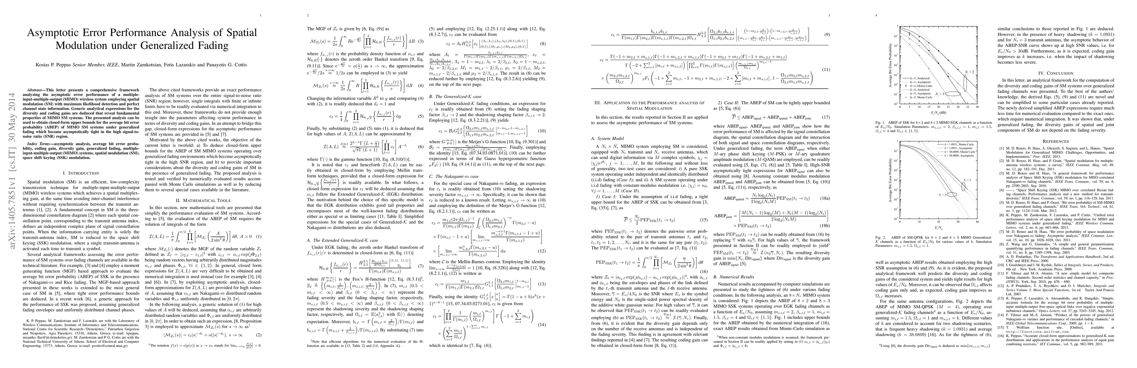An asymptotic error performance analysis framework for spatial modulation under generalized fading was presented.