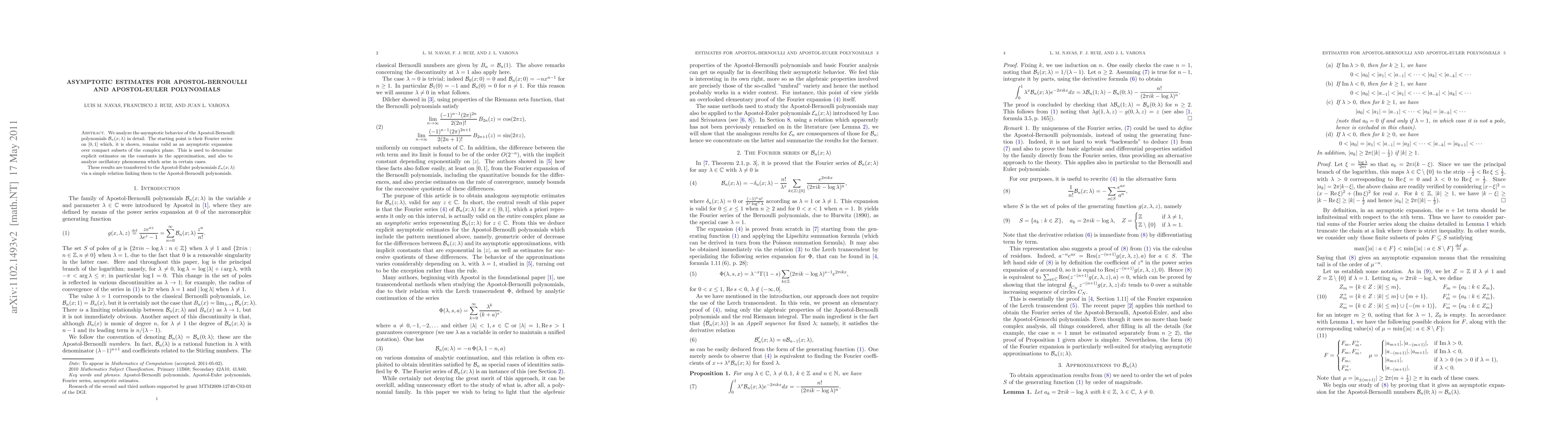 We analyze the asymptotic behavior of the Apostol-Bernoulli polynomials $\mathcal{B}_{n}(x;\lambda)$ in detail. The starting point is their Fourier series on $[0,1]$ which, it is shown, remains valid as an asymptotic expansion over compact subsets of the complex plane. This is used to determine explicit estimates on the constants in the approximation, and also to analyze oscillatory phenomena which arise in certain cases. These results are transferred to the Apostol-Euler polynomials $\mathcal{E}_{n}(x;\lambda)$ via a simple relation linking them to the Apostol-Bernoulli polynomials.