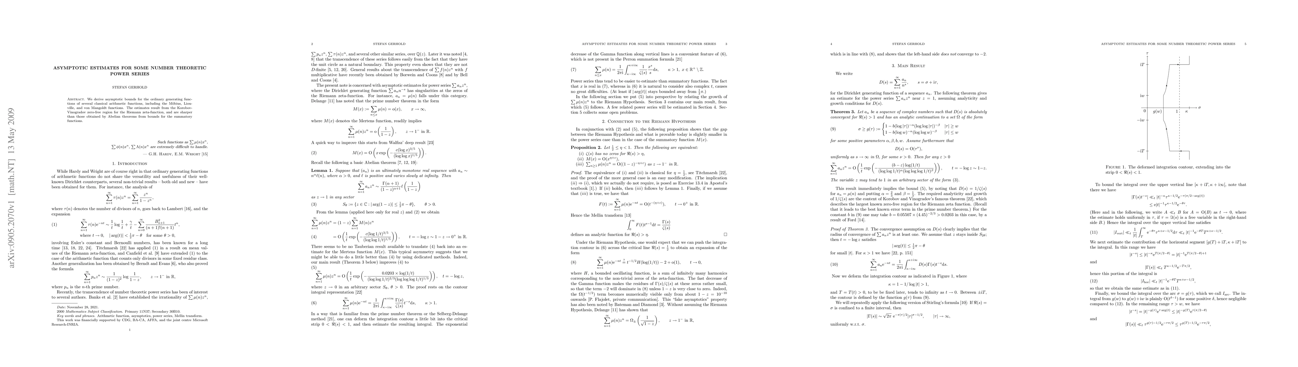 Researchers derived asymptotic bounds for the ordinary generating functions of classical arithmetic functions like Moebius, Liouville, and von Mangoldt using the Korobov-Vinogradov zero-free region for the Riemann zeta-function.