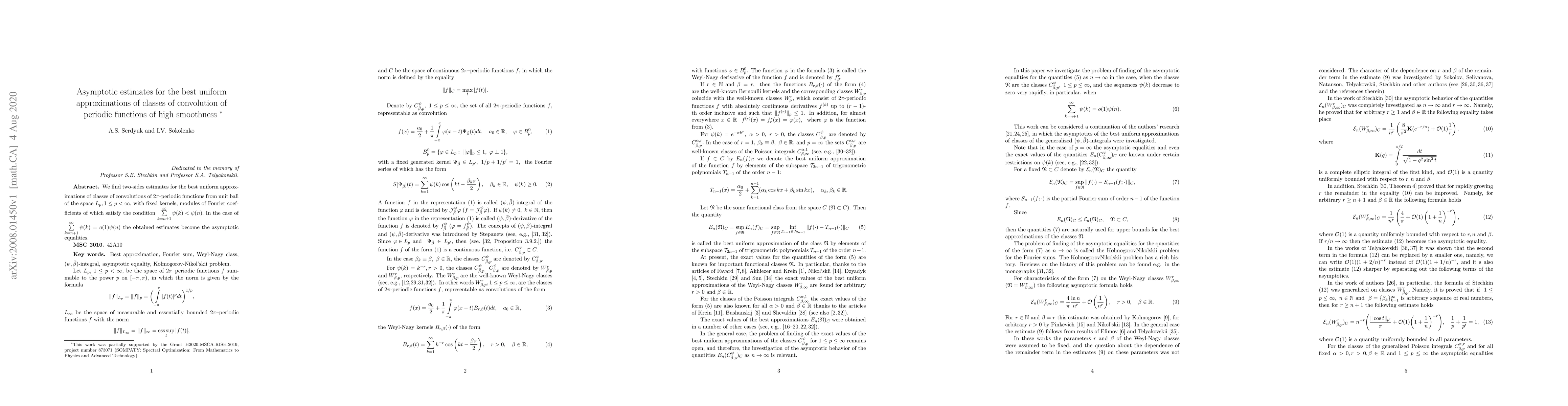 This paper provides two-sided estimates for the best uniform approximations of convolutions of $2\pi$-periodic functions from $L_p$ spaces, with kernels whose Fourier coefficients satisfy a specific decay condition. When the decay condition is stricter, the estimates become asymptotic equalities.