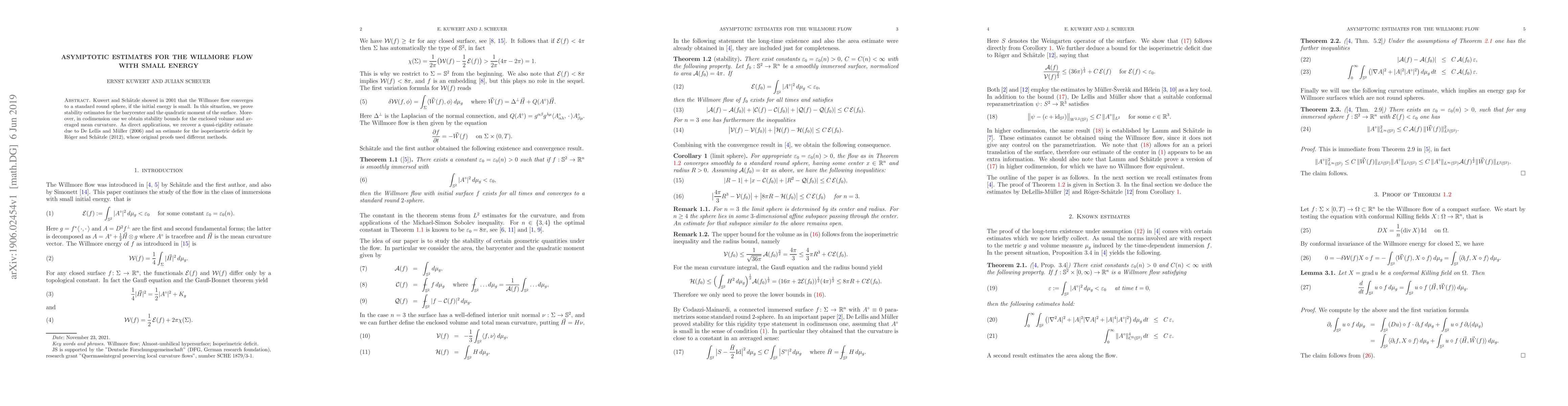 Researchers prove stability estimates for surface properties like barycenter, quadratic moment, volume, and mean curvature after applying the Willmore flow with small energy, recovering earlier quasi-rigidity and isoperimetric deficit estimates.