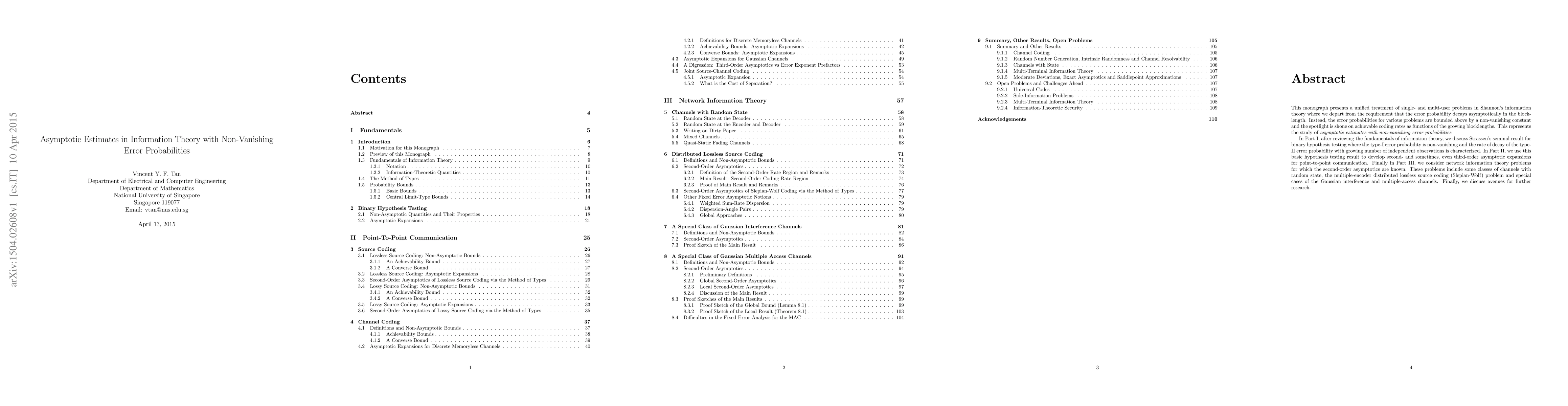 This monograph explores information theory problems where error probabilities remain non-vanishing, focusing on achievable coding rates as blocklengths grow. It develops second-order asymptotic expansions for point-to-point communication and examines network information theory problems, including channels with random state and distributed lossless source coding.