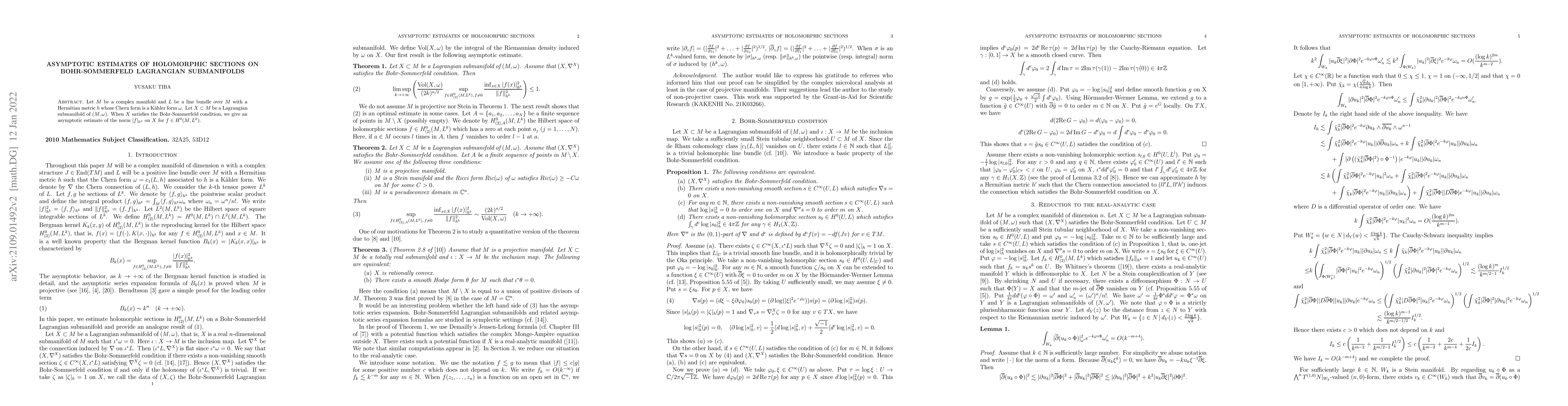 Let $M$ be a complex manifold and $L$ be a line bundle over $M$ with a Hermitian metric $h$ whose Chern form is a K\"ahler form $\omega$. Let $X \subset M$ be a Lagrangian submanifold of $(M, \omega)$. When $X$ satisfies the Bohr-Sommerfeld condition, we give an asymptotic estimate of the norm $|f|_{h^k}$ on $X$ for $f \in H^0(M, L^k)$.