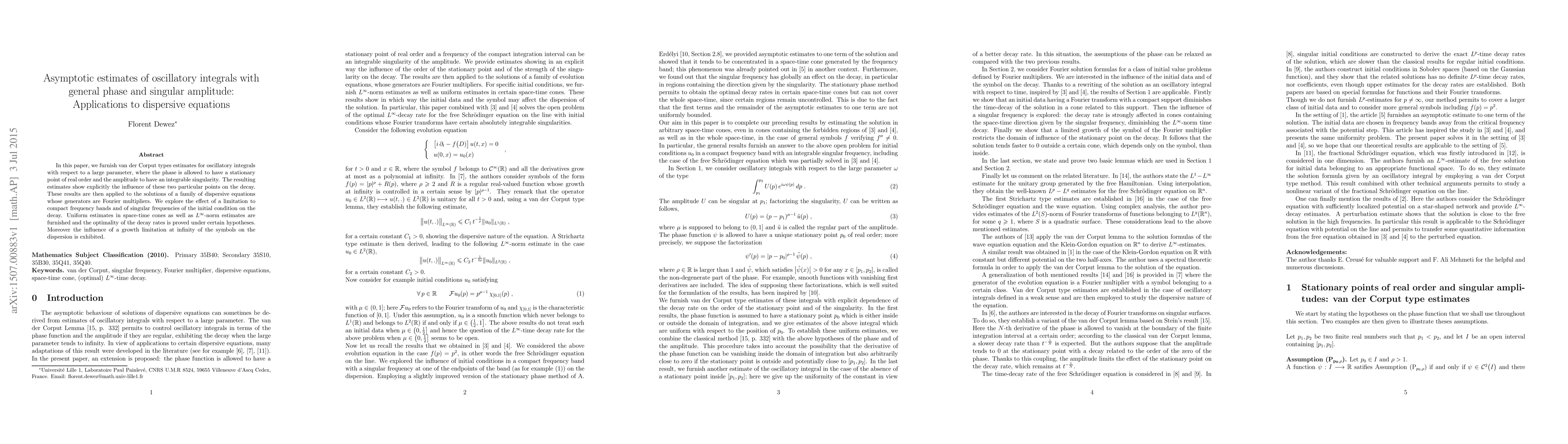 In this paper, we furnish van der Corput types estimates for oscillatory integrals with respect to a large parameter, where the phase is allowed to have a stationary point of real order and the amplitude to have an integrable singularity. The resulting estimates show explicitly the influence of these two particular points on the decay. These results are then applied to the solutions of a family of dispersive equations whose generators are Fourier multipliers. We explore the effect of a limitation to compact frequency bands and of singular frequencies of the initial condition on the decay. Uniform estimates in space-time cones as well as L-infinity-norm estimates are furnished and the optimality of the decay rates is proved under certain hypotheses. Moreover the influence of a growth limitation at infinity of the symbols on the dispersion is exhibited.
