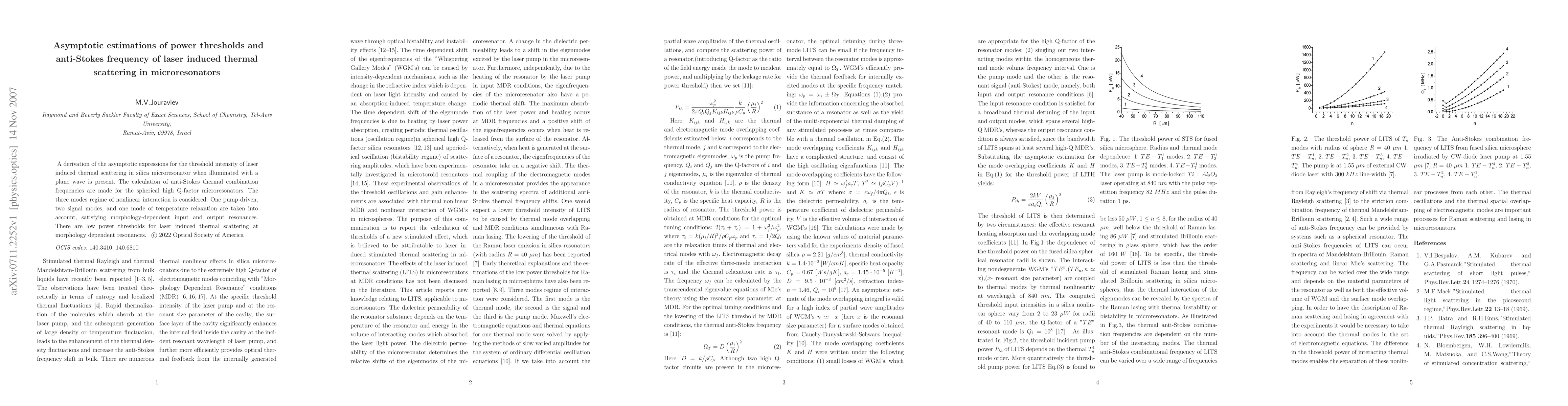 A derivation of the asymptotic expressions for the threshold intensity of laser induced thermal scattering in silica microresonator when illuminated with a plane wave is present. The calculation of anti-Stokes thermal combination frequencies are made for the spherical high Q-factor microresonators. The three modes regime of nonlinear interaction is considered. One pump-driven, two signal modes, and one mode of temperature relaxation are taken into account, satisfying morphology-dependent input and output resonances. There are low power thresholds for laser induced thermal scattering at morphology dependent resonances.