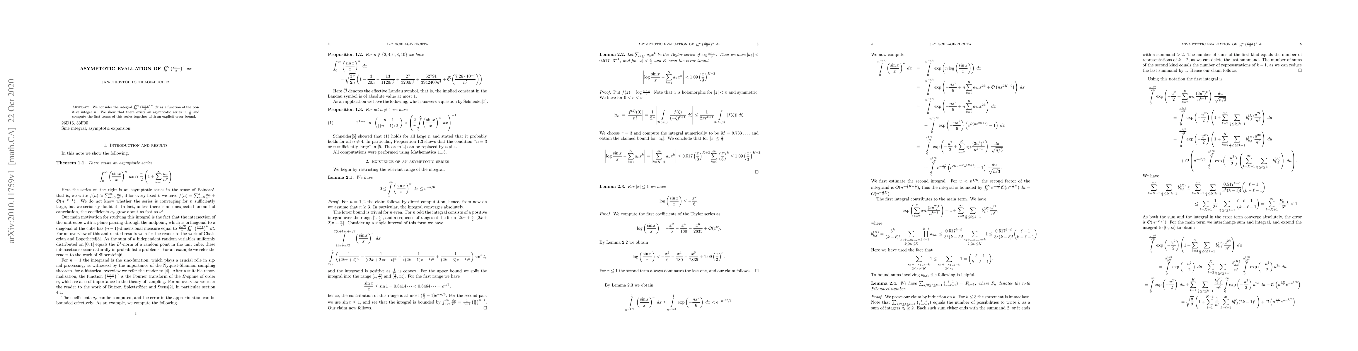 We consider the integral $\int_0^\infty\left(\frac{\sin x}{x}\right)^n\;dx$ as a function of the positive integer $n$. We show that there exists an asymptotic series in $\frac{1}{n}$ and compute the first terms of this series together with an explicit error bound.