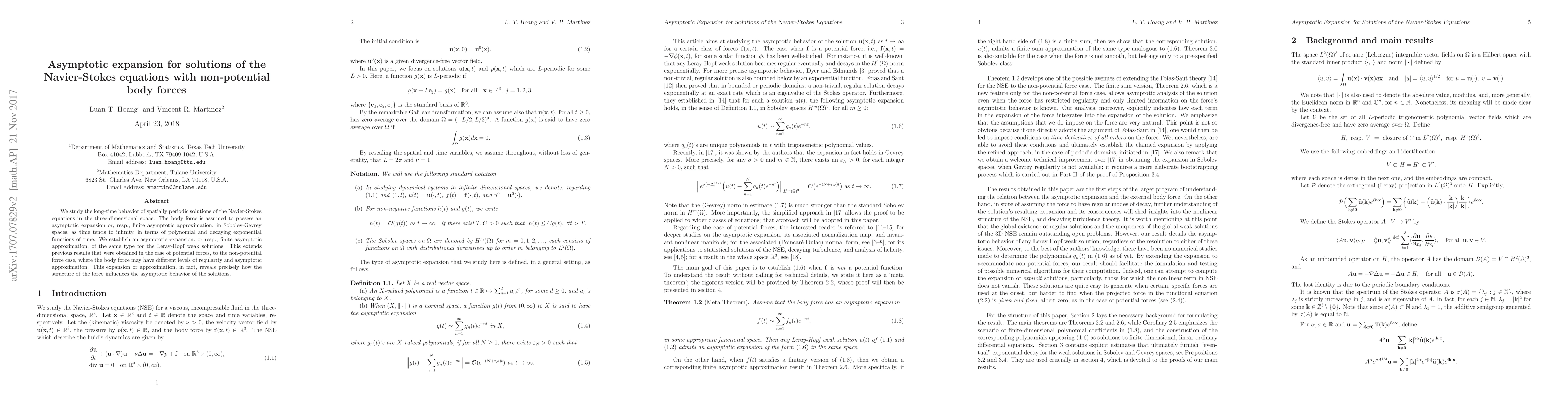 This paper investigates the long-term behavior of spatially periodic solutions to the Navier-Stokes equations under non-potential body forces, establishing an asymptotic expansion for Leray-Hopf weak solutions. The analysis extends previous results for potential forces and reveals how varying force regularity and asymptotic properties affect solution behavior.