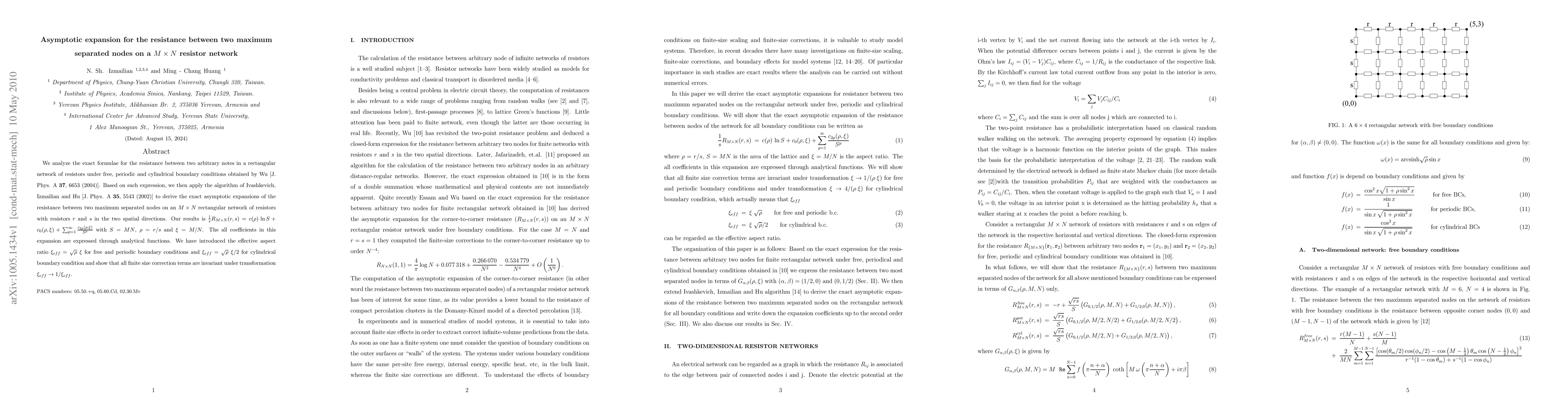 This paper analyzes the resistance between two maximum separated nodes in an $M \times N$ rectangular resistor network, deriving exact asymptotic expansions under different boundary conditions. The results show that the resistance follows a logarithmic dependence on the network size with analytical coefficients, and introduces an effective aspect ratio invariant under transformation.