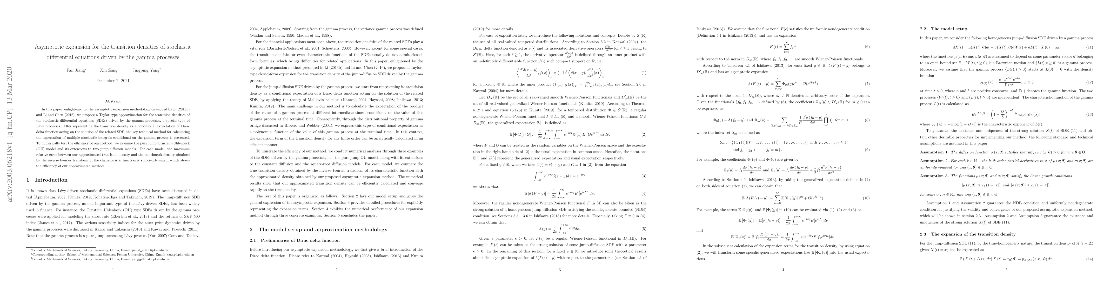 In this paper, enlightened by the asymptotic expansion methodology developed by Li(2013b) and Li and Chen (2016), we propose a Taylor-type approximation for the transition densities of the stochastic differential equations (SDEs) driven by the gamma processes, a special type of Levy processes. After representing the transition density as a conditional expectation of Dirac delta function acting on the solution of the related SDE, the key technical method for calculating the expectation of multiple stochastic integrals conditional on the gamma process is presented. To numerically test the efficiency of our method, we examine the pure jump Ornstein--Uhlenbeck (OU) model and its extensions to two jump-diffusion models. For each model, the maximum relative error between our approximated transition density and the benchmark density obtained by the inverse Fourier transform of the characteristic function is sufficiently small, which shows the efficiency of our approximated method.