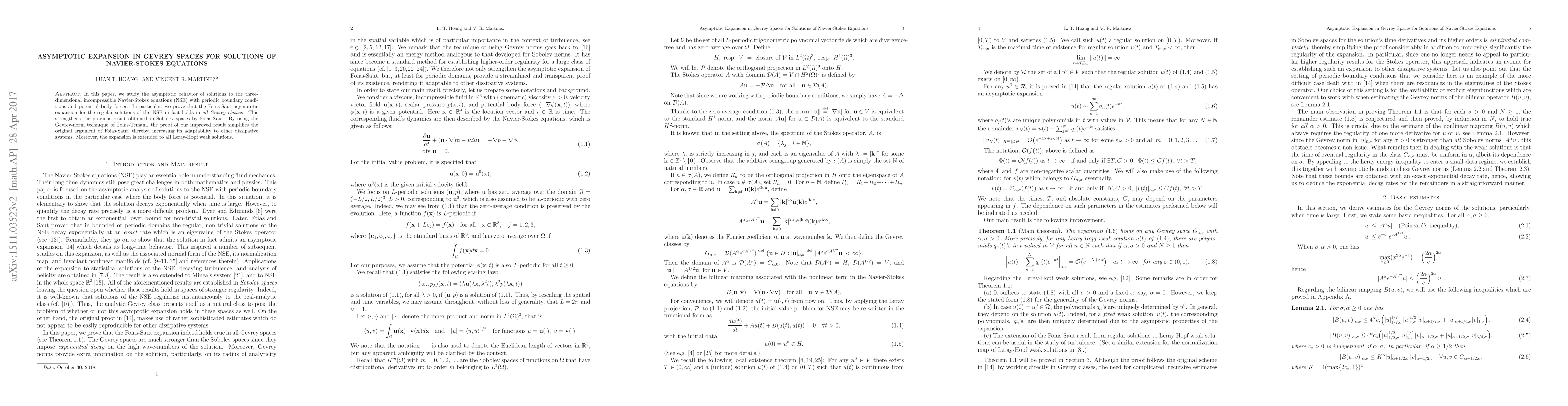 In this paper, we study the asymptotic behavior of solutions to the three-dimensional incompressible Navier-Stokes equations (NSE) with periodic boundary conditions and potential body forces. In particular, we prove that the Foias-Saut asymptotic expansion for the regular solutions of the NSE in fact holds in {\textit{all Gevrey classes}}. This strengthens the previous result obtained in Sobolev spaces by Foias-Saut. By using the Gevrey-norm technique of Foias-Temam, the proof of our improved result simplifies the original argument of Foias-Saut, thereby, increasing its adaptability to other dissipative systems. Moreover, the expansion is extended to all Leray-Hopf weak solutions.