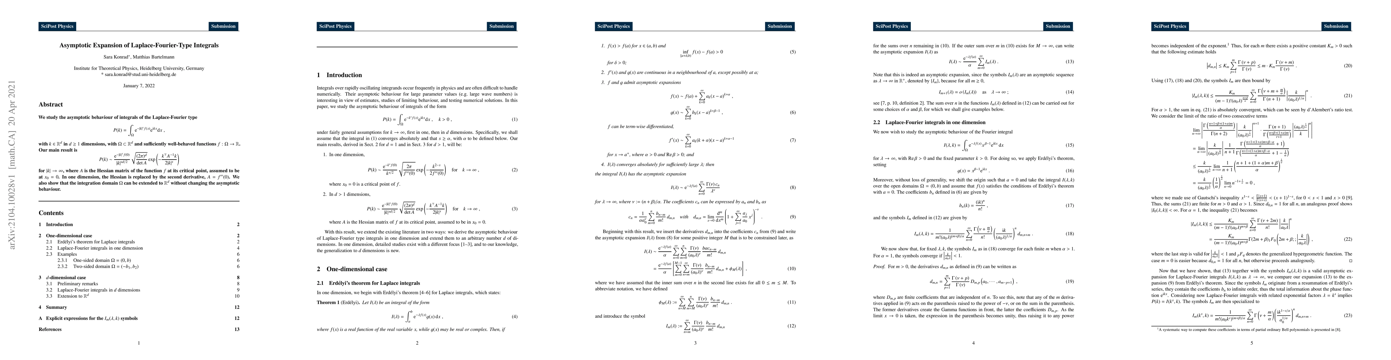 This paper investigates the asymptotic expansion of Laplace-Fourier integrals of the form $P(k)$, revealing that for large $|k|$, $P(k) \sim \frac{\mathrm{e}^{-|k|^sf(0)}}{|k|^{sd/2}}\sqrt{\frac{(2\pi)^d}{\det A}} \exp\left(-\frac{k^\top A^{-1}k}{2|k|^s}\right)$, where $A$ is the Hessian matrix of $f$ at its critical point. The result holds in $d\ge1$ dimensions.