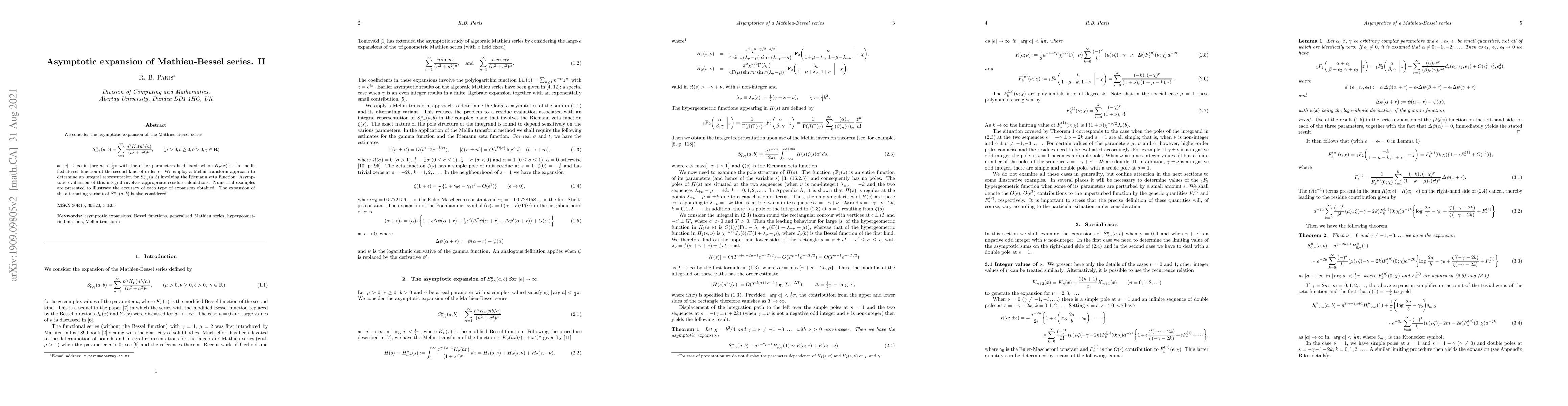 We consider the asymptotic expansion of the Mathieu-Bessel series \[S_{\nu,\gamma}^{\mu}(a,b)=\sum_{n=1}^\infty \frac{n^\gamma K_\nu(nb/a)}{(n^2+a^2)^\mu}, \qquad (\mu>0, \nu\geq 0, b>0, \gamma\in {\bf R})\] as $|a|\to\infty$ in $|\arg\,a|<\pi/2$ with the other parameters held fixed, where $K_\nu(x)$ is the modified Bessel function of the second kind of order $\nu$. We employ a Mellin transform approach to determine an integral representation for $S_{\nu,\gamma}^{\mu}(a,b)$ involving the Riemann zeta function. Asymptotic evaluation of this integral involves appropriate residue calculations. Numerical examples are presented to illustrate the accuracy of each type of expansion obtained. The expansion of the alternating variant of $S_{\nu,\gamma}^\mu(a,b)$ is also considered.