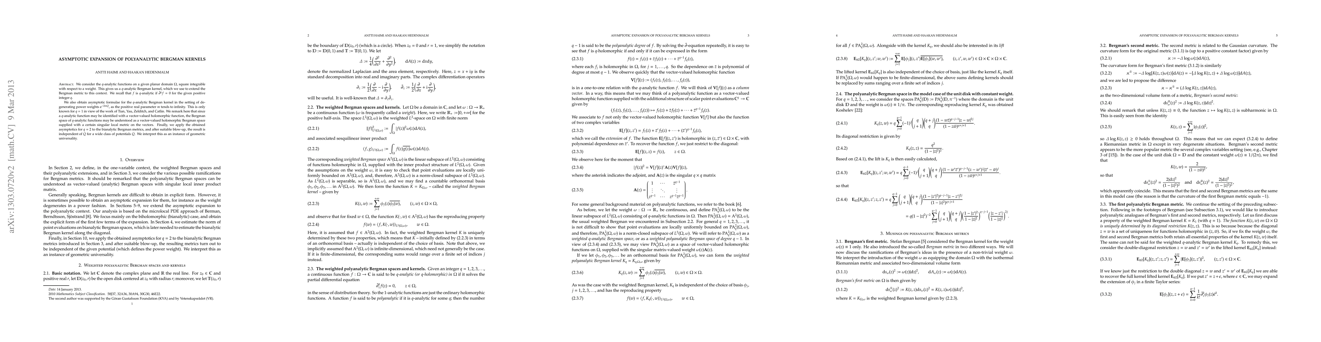 We consider mainly the Hilbert space of bianalytic functions on a given domain in the plane, square integrable with respect to a weight. We show how to obtain the asymptotic expansion of the corresponding bianalytic Bergman kernel for power weights, under the standard condition on those weights. This is known only in the analytic setting, from the work of e.g. Tian, Yau, Zelditch, Catlin, et al. We remark that a bianalytic function may be identified with a vector-valued analytic function, supplied with a locally singular metric on the vectors. We also apply our findings to two bianalytic Bergman metrics introduced here.