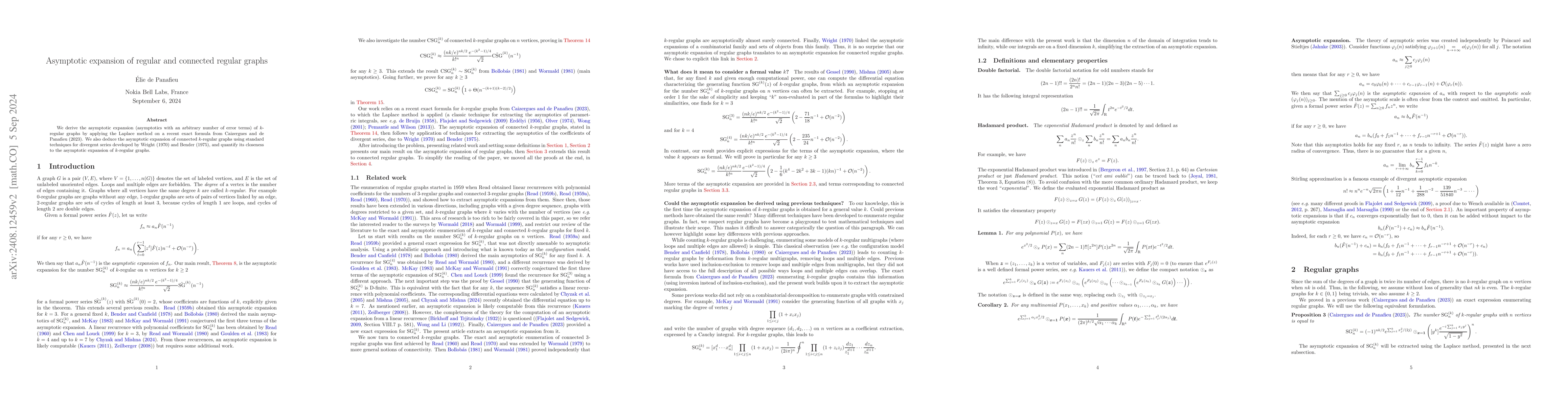 This paper derives the asymptotic expansion for k-regular graphs using the Laplace method on an exact formula. It also extends this approach to connected k-regular graphs, utilizing techniques for divergent series to quantify their asymptotic behavior.