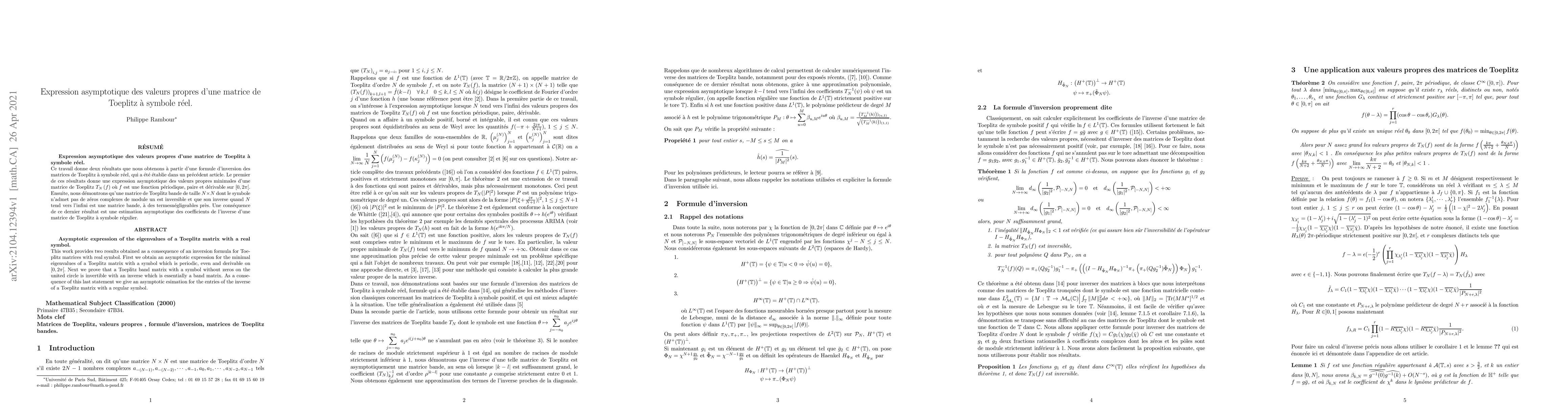 Asymptotic expansion of the eigenvalues of a Toeplitz matrix with real symbol. This work provides two results obtained as a consequence of an inversion formula for Toeplitz matrices with real symbol. First we obtain an symptotic expression for the minimal eigenvalues of a Toeplitz matrix with a symbol which is periodic, even and derivable on $[0, 2\pi[$. Next we prove that a Toeplitz band matrix with a symbol without zeros on the united circle is invertible with an inverse which is essentially a band matrix. As a consequence of this last statement we give an asymptotic estimation for the entries of the inverse of a Toplitz matrix with a regular symbol.