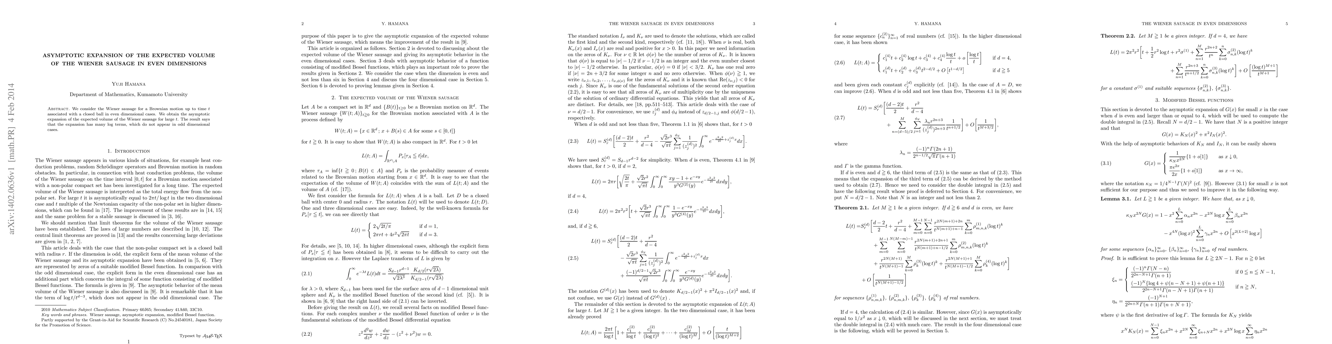Summary: This paper derives the asymptotic expansion for the expected volume of the Wiener sausage in even dimensions for large time $t$, revealing a series of logarithmic terms not present in odd dimensions. The findings highlight unique dimensional properties of the Wiener sausage.