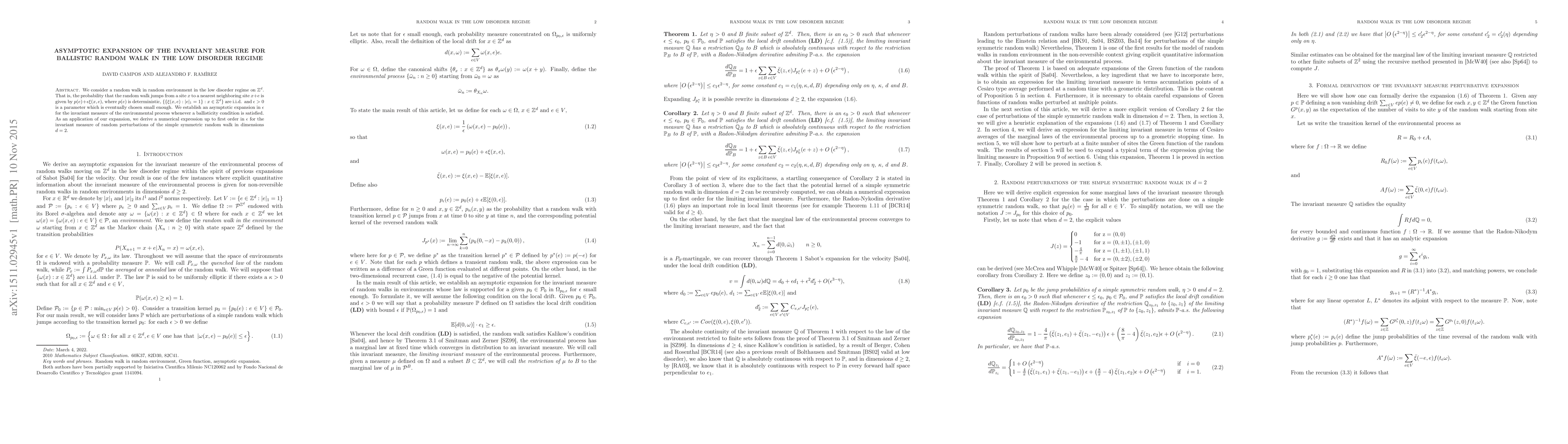This paper investigates the asymptotic expansion of the invariant measure for a ballistic random walk in a low disorder regime on $\mathbb Z^d$. It establishes an expansion in $\epsilon$ for the invariant measure under a ballisticity condition, and provides a first-order numerical expression for the measure in two dimensions.