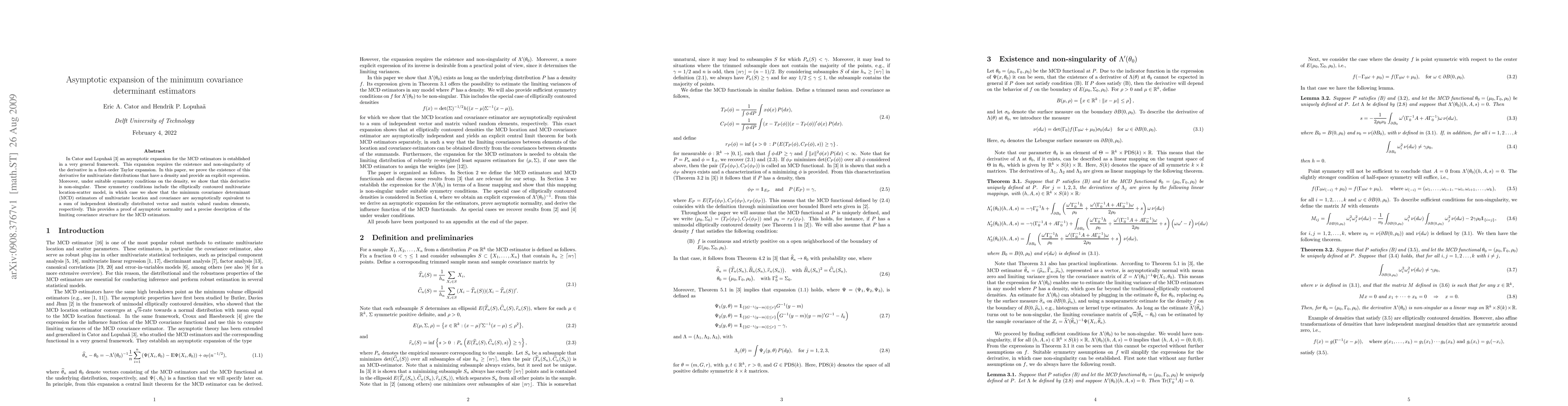 This paper establishes an asymptotic expansion for minimum covariance determinant (MCD) estimators, proving the existence and non-singularity of the required derivative under suitable symmetry conditions, including elliptically contoured distributions. This leads to asymptotic normality and a detailed description of the limiting covariance structure for MCD estimators.
