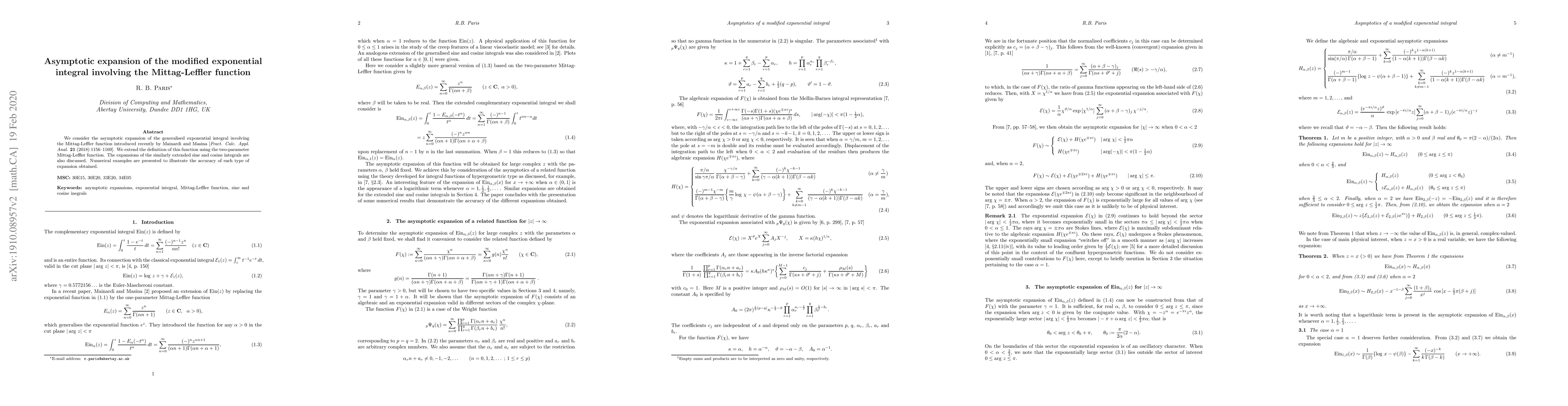 This paper investigates the asymptotic expansion of a modified exponential integral involving the Mittag-Leffler function, with numerical examples provided to demonstrate its accuracy.