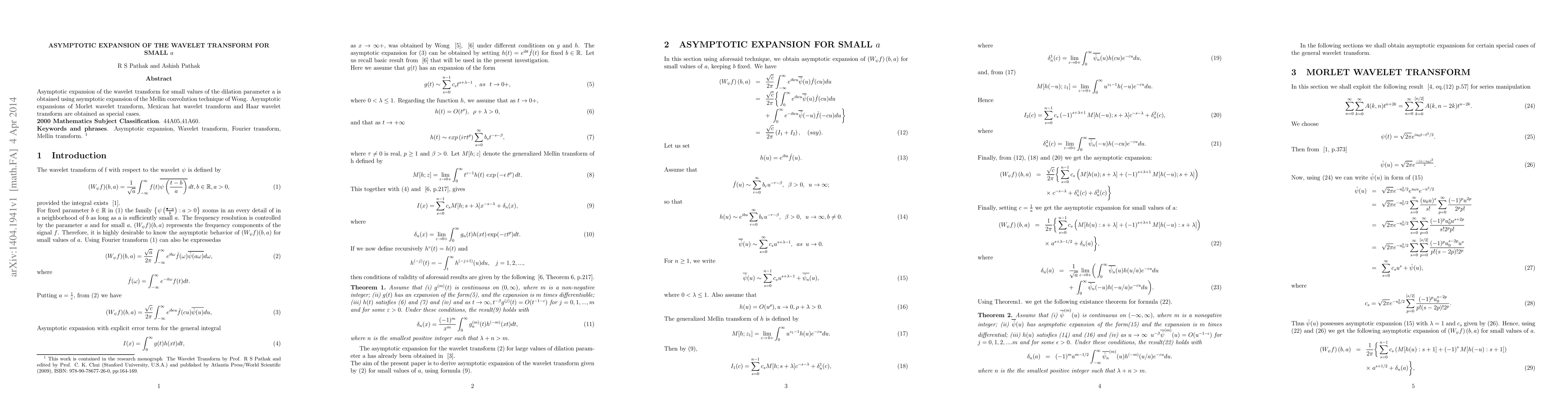 Asymptotic expansion of the wavelet transform for small values of the dilation parameter a is obtained using asymptotic expansion of the Mellin convolution technique ofWong. Asymptotic expansions of Morlet wavelet transform, Mexican hat wavelet transform and Haar wavelet transform are obtained as special cases.