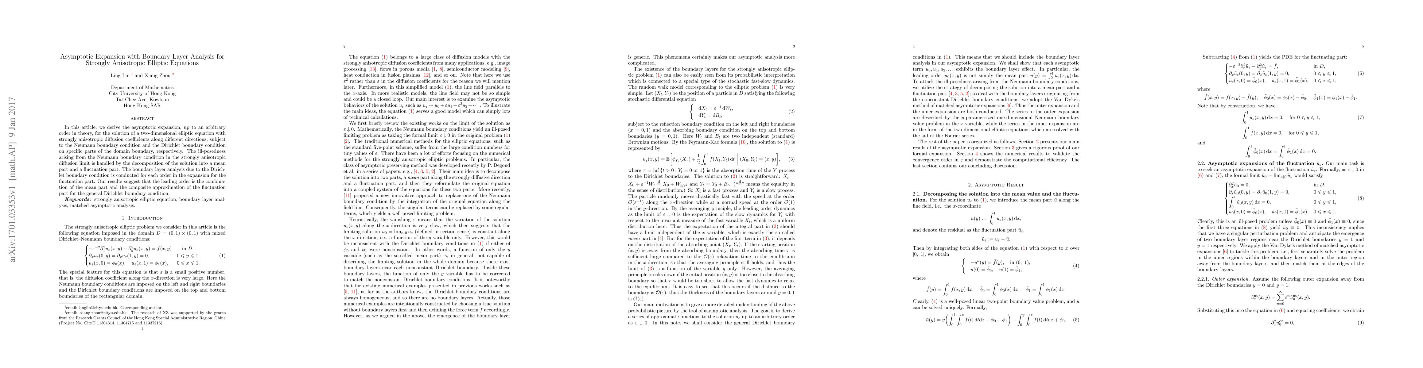 This paper derives an asymptotic expansion for solutions of strongly anisotropic elliptic equations in two dimensions, addressing the ill-posedness from Neumann boundary conditions through decomposition into mean and fluctuation parts. The boundary layer analysis for the fluctuation part under Dirichlet conditions reveals the leading order solution as a composite of the mean and fluctuation approximations.
