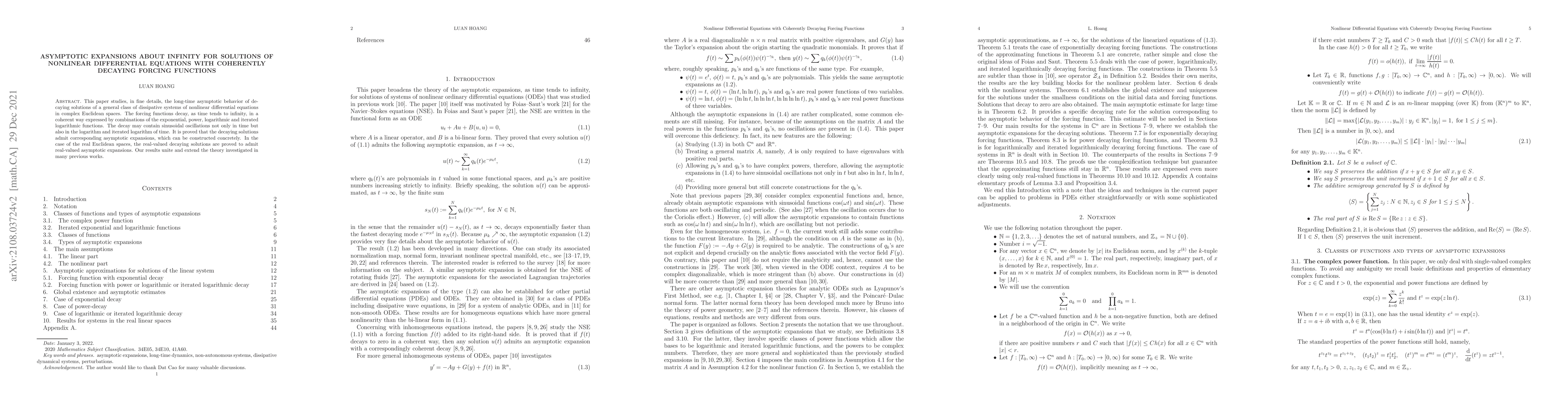 This paper investigates the long-term asymptotic behavior of solutions to nonlinear differential equations with coherently decaying forcing functions, proving the existence of corresponding asymptotic expansions. The study extends previous theories by incorporating complex and real-valued decaying solutions with sinusoidal oscillations in time and logarithmic terms.