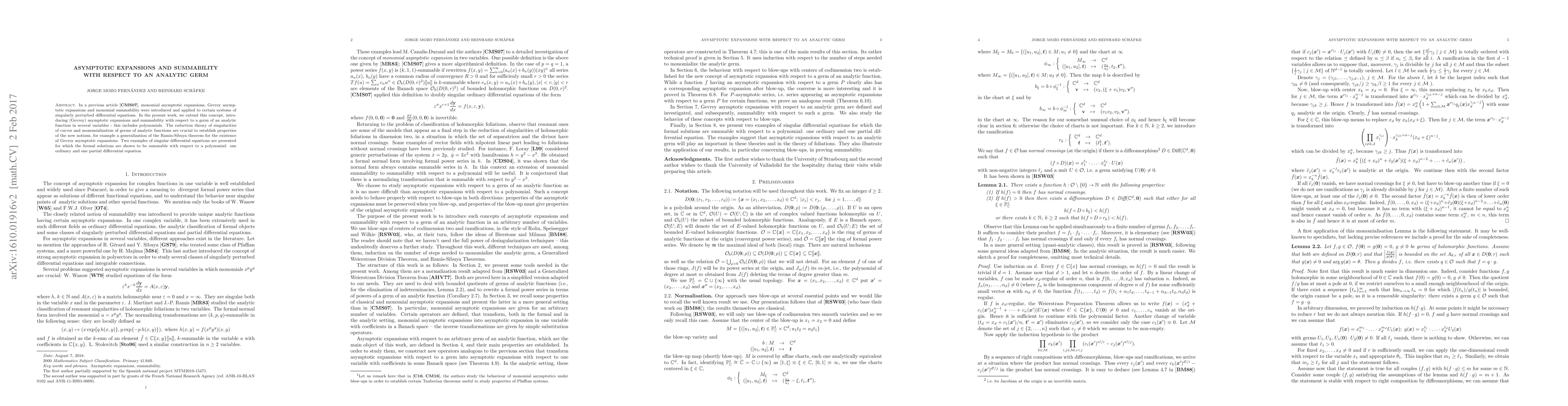 This paper extends the concept of asymptotic expansions and summability to germs of analytic functions in several variables, including polynomials. It employs reduction theory and monomialization to establish properties, such as a generalized Ramis-Sibuya theorem, and provides examples of singular differential equations where formal solutions are summable.