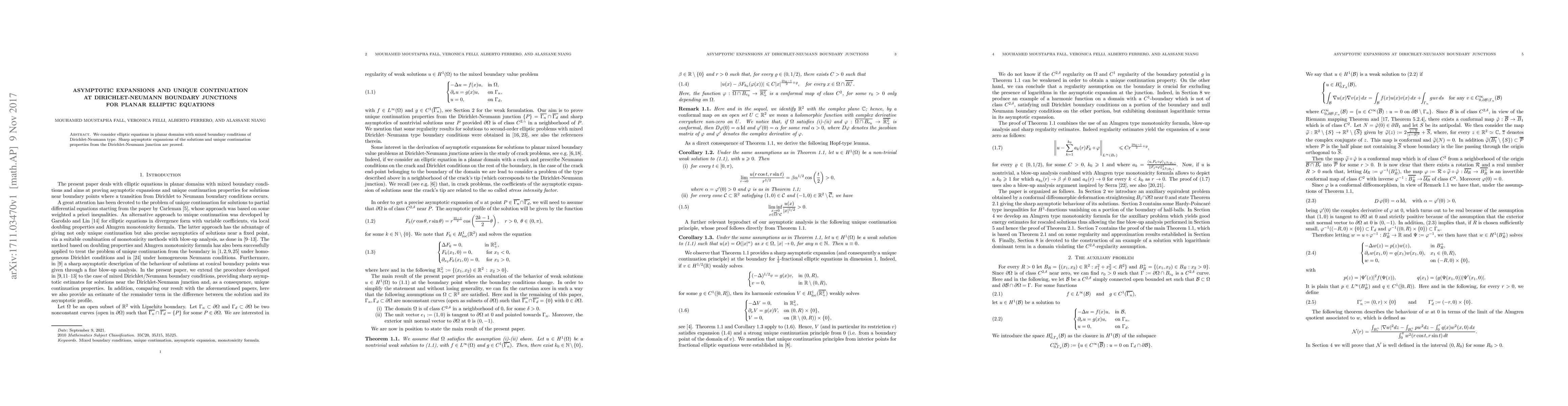 This paper investigates elliptic equations in planar domains with mixed Dirichlet-Neumann boundary conditions, proving sharp asymptotic expansions of solutions and establishing unique continuation properties at the boundary junctions.
