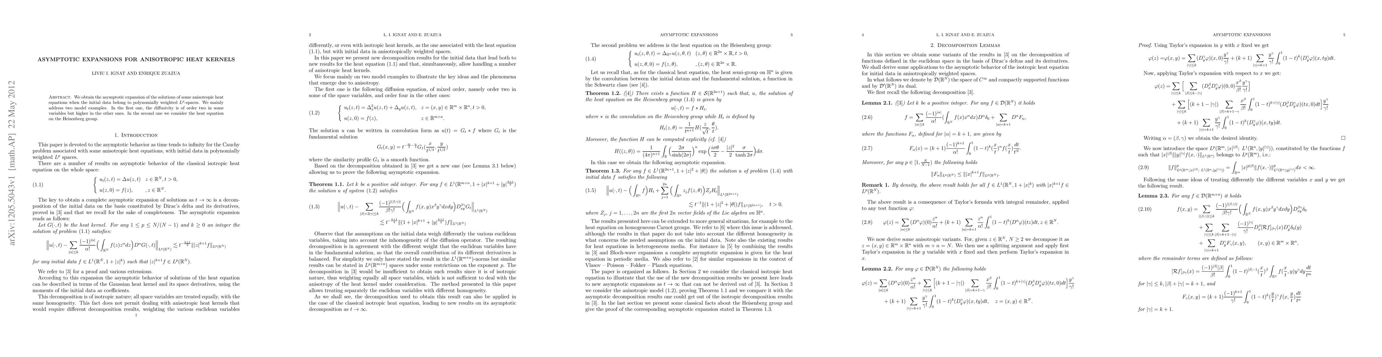 This paper finds asymptotic expansions for solutions of anisotropic heat equations on polynomially weighted Lp-spaces, focusing on two model examples involving diffusivity variations and the Heisenberg group.