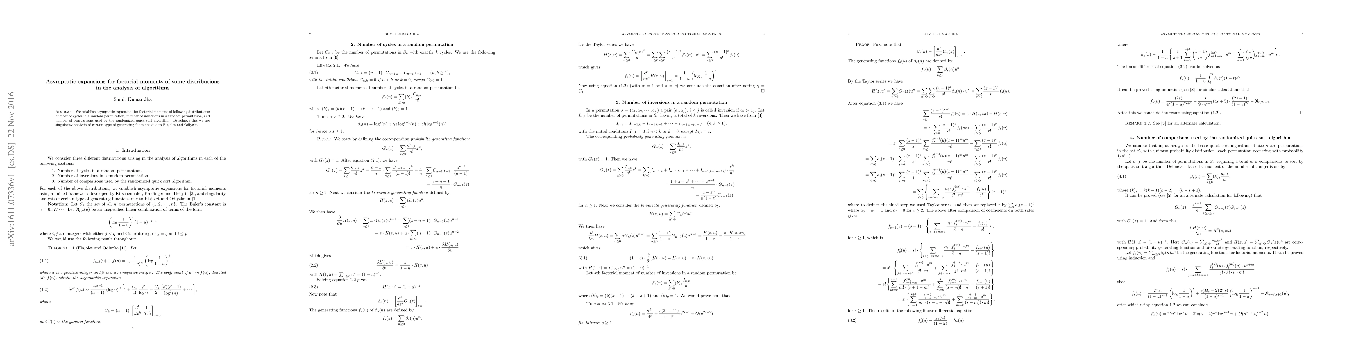 We establish asymptotic expansions for factorial moments of following distributions: number of cycles in a random permutation, number of inversions in a random permutation, and number of comparisons used by the randomized quick sort algorithm.To achieve this we use singularity analysis of certain type of generating functions due to Flajolet and Odlyzko.