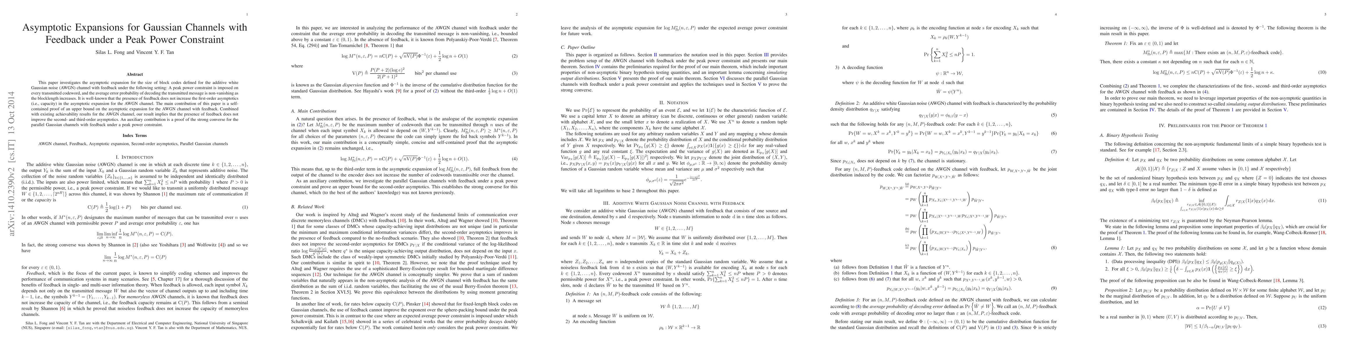 This paper provides an asymptotic expansion for block codes on the AWGN channel with feedback under a peak power constraint, proving an upper bound that confirms feedback does not enhance second- and third-order terms. Additionally, it establishes a strong converse for parallel Gaussian channels with feedback under similar constraints.
