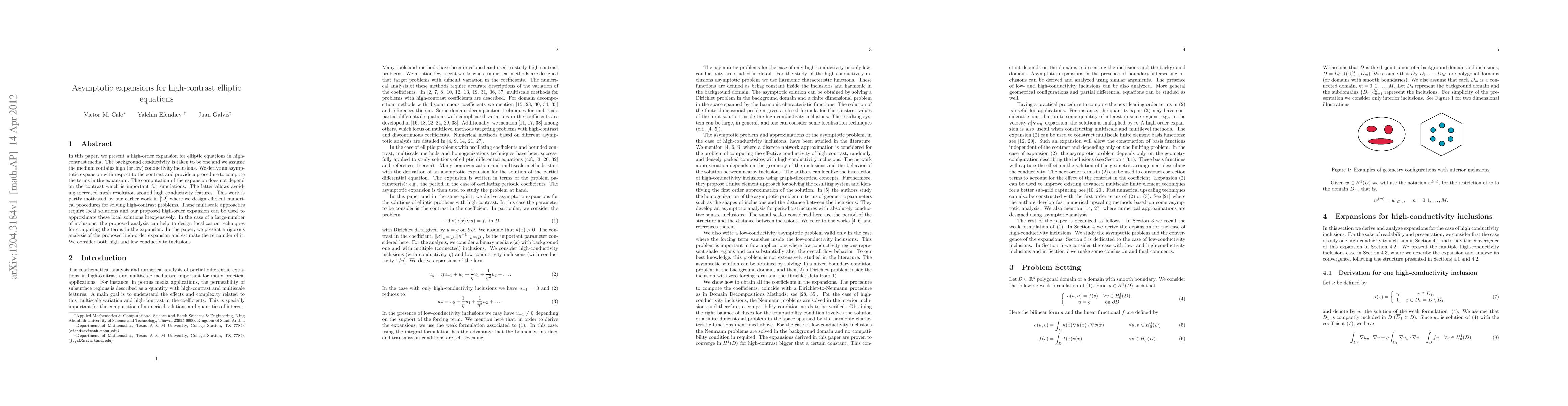 In this paper, we present a high-order expansion for elliptic equations in high-contrast media. The background conductivity is taken to be one and we assume the medium contains high (or low) conductivity inclusions. We derive an asymptotic expansion with respect to the contrast and provide a procedure to compute the terms in the expansion. The computation of the expansion does not depend on the contrast which is important for simulations. The latter allows avoiding increased mesh resolution around high conductivity features. This work is partly motivated by our earlier work in \cite{ge09_1} where we design efficient numerical procedures for solving high-contrast problems. These multiscale approaches require local solutions and our proposed high-order expansion can be used to approximate these local solutions inexpensively. In the case of a large-number of inclusions, the proposed analysis can help to design localization techniques for computing the terms in the expansion. In the paper, we present a rigorous analysis of the proposed high-order expansion and estimate the remainder of it. We consider both high and low conductivity inclusions.