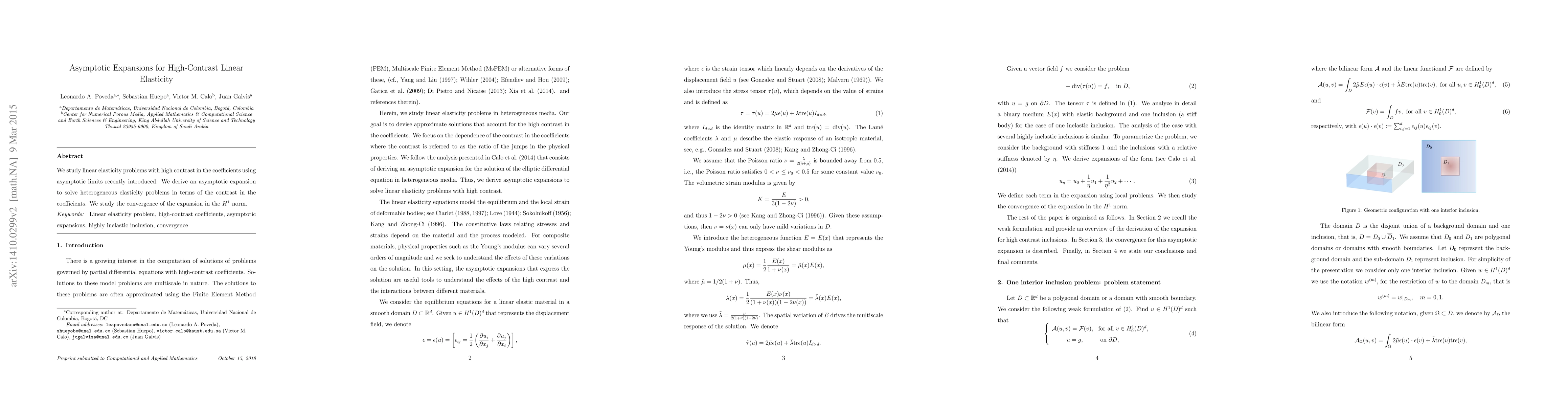 We study linear elasticity problems with high contrast in the coefficients using asymptotic limits recently introduced. We derive an asymptotic expansion to solve heterogeneous elasticity problems in terms of the contrast in the coefficients. We study the convergence of the expansion in the $H^1$ norm.