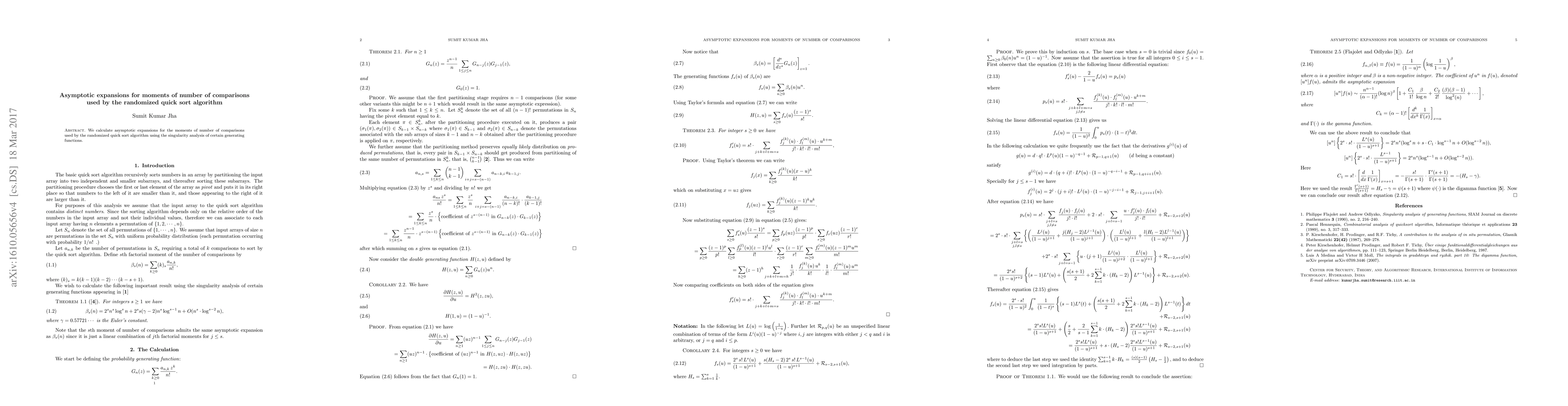 Researchers used singularity analysis to calculate asymptotic expansions for the moments of number of comparisons in randomized quick sort, providing insights into algorithm efficiency.