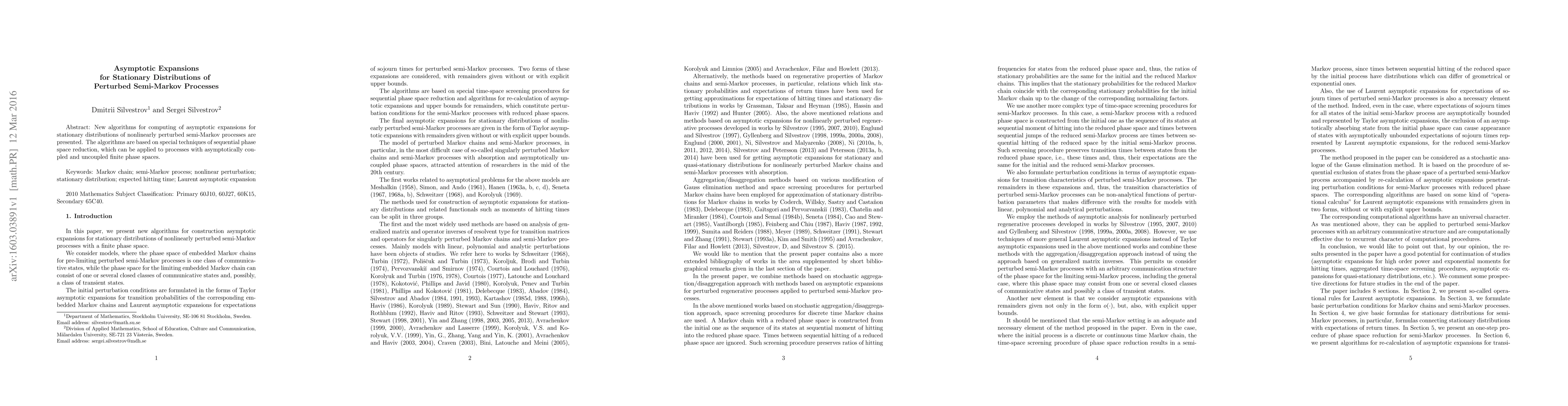 Summary: This paper introduces new algorithms for calculating asymptotic expansions of stationary distributions in nonlinearly perturbed semi-Markov processes, utilizing sequential phase space reduction techniques applicable to both coupled and uncoupled finite phase spaces.