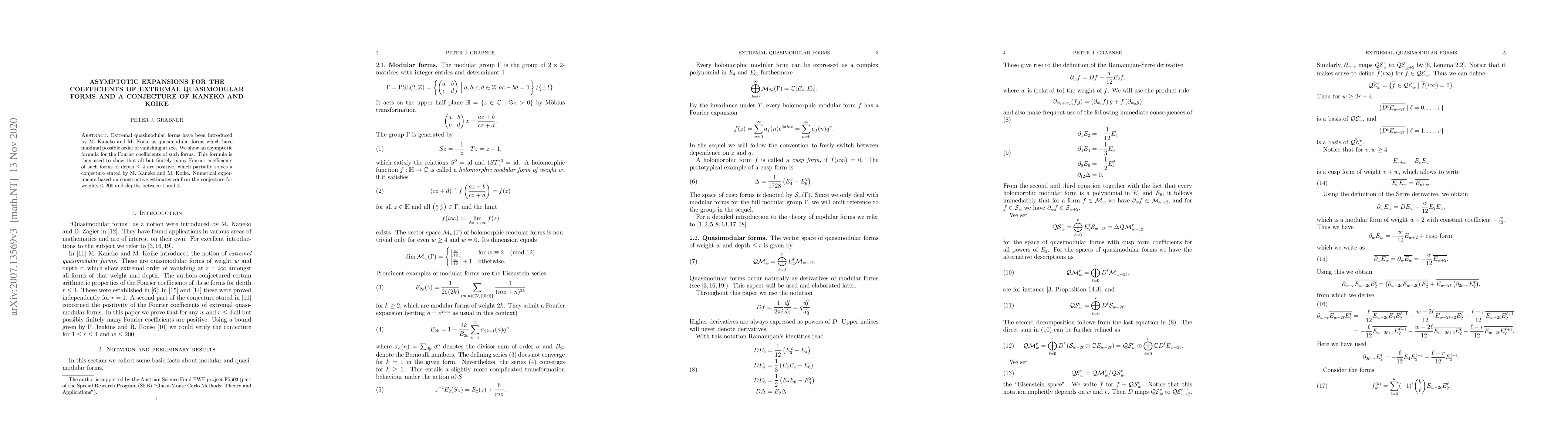 This paper presents an asymptotic formula for the Fourier coefficients of extremal quasimodular forms, demonstrating that most coefficients of such forms up to depth 4 are positive, thus partially confirming a conjecture by Kaneko and Koike. Numerical experiments support the conjecture for weights up to 200 and depths between 1 and 4.