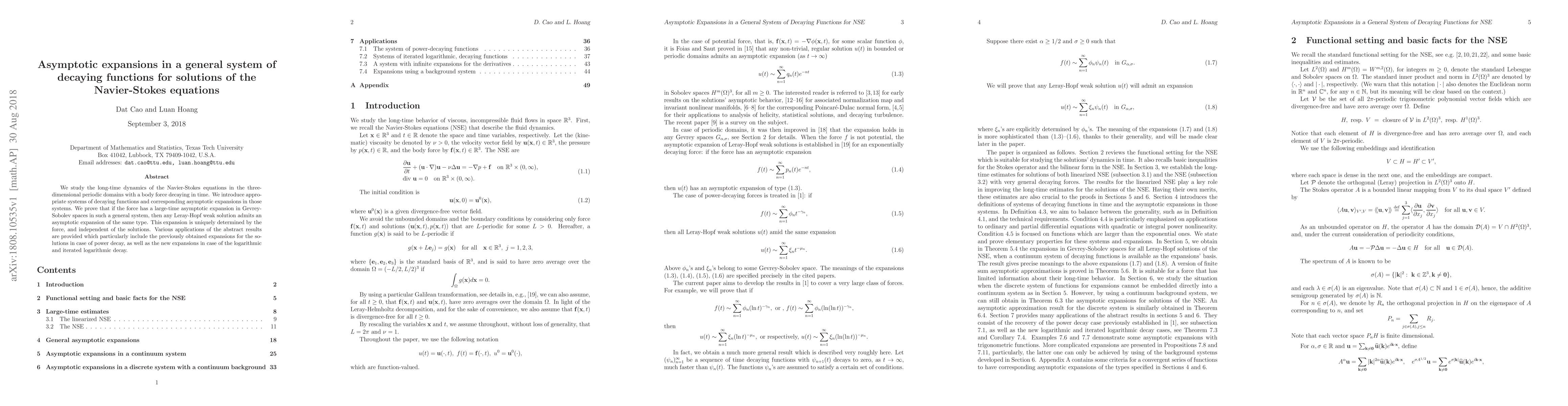 We study the long-time dynamics of the Navier-Stokes equations in the three-dimensional periodic domains with a body force decaying in time. We introduce appropriate systems of decaying functions and corresponding asymptotic expansions in those systems. We prove that if the force has a large-time asymptotic expansion in Gevrey-Sobolev spaces in such a general system, then any Leray-Hopf weak solution admits an asymptotic expansion of the same type. This expansion is uniquely determined by the force, and independent of the solutions. Various applications of the abstract results are provided which particularly include the previously obtained expansions for the solutions in case of power decay, as well as the new expansions in case of the logarithmic and iterated logarithmic decay.